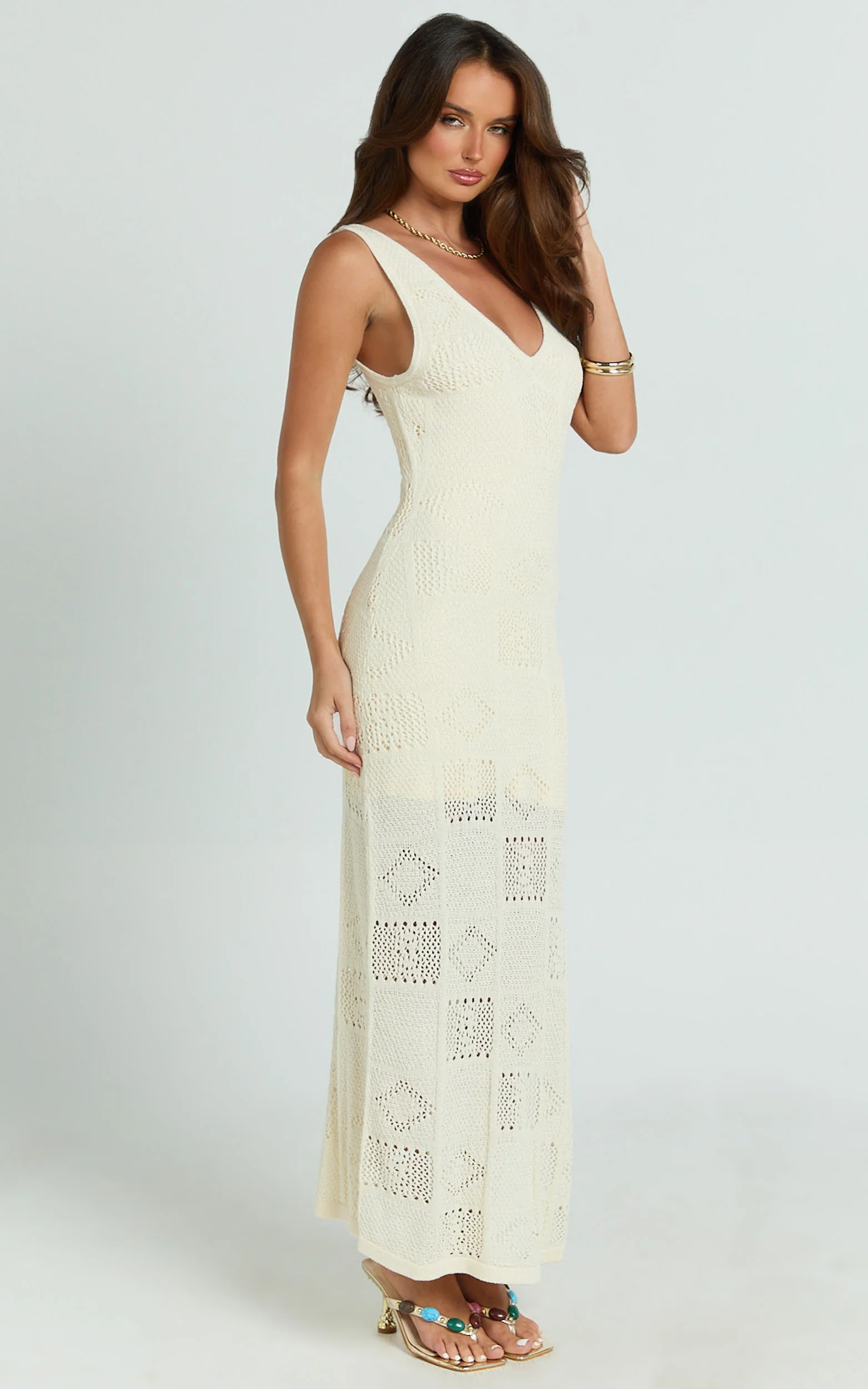 Taylor Maxi Dress - Crochet Knit Scoop Neck Dress in Cream
