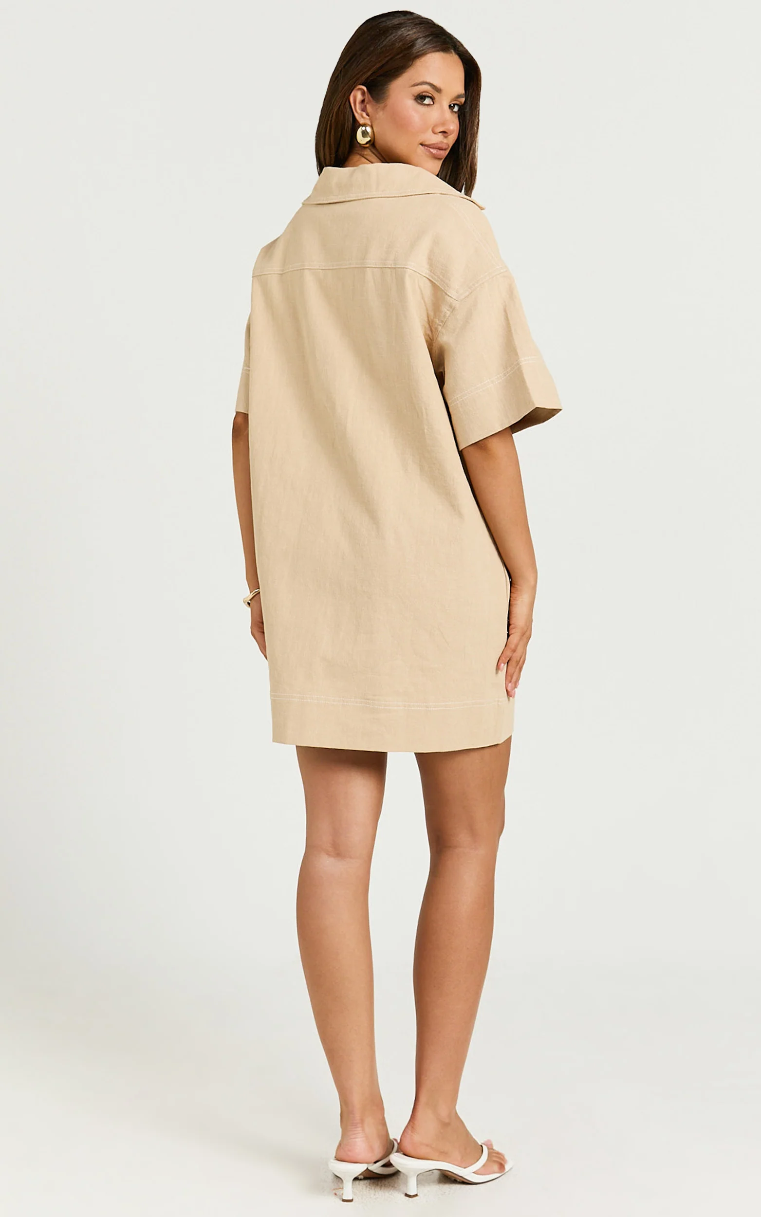 Sanvi Mini Dress - Linen Collared Pocket Shift Dress in Beige