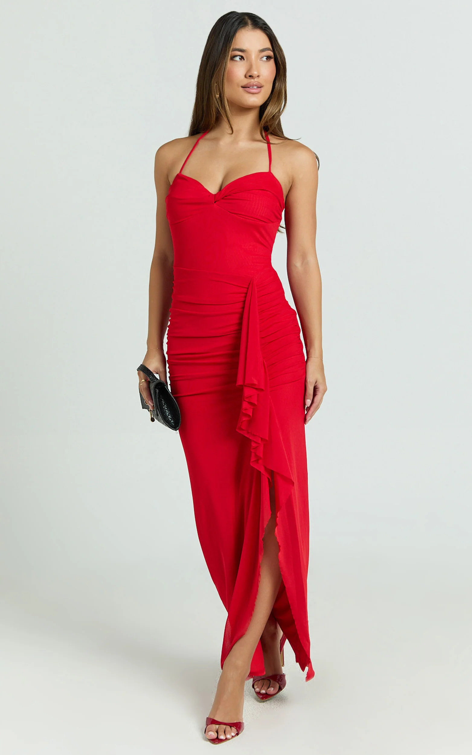 Silvana Maxi Dress - Halter Ruched Side Split Dress in Red