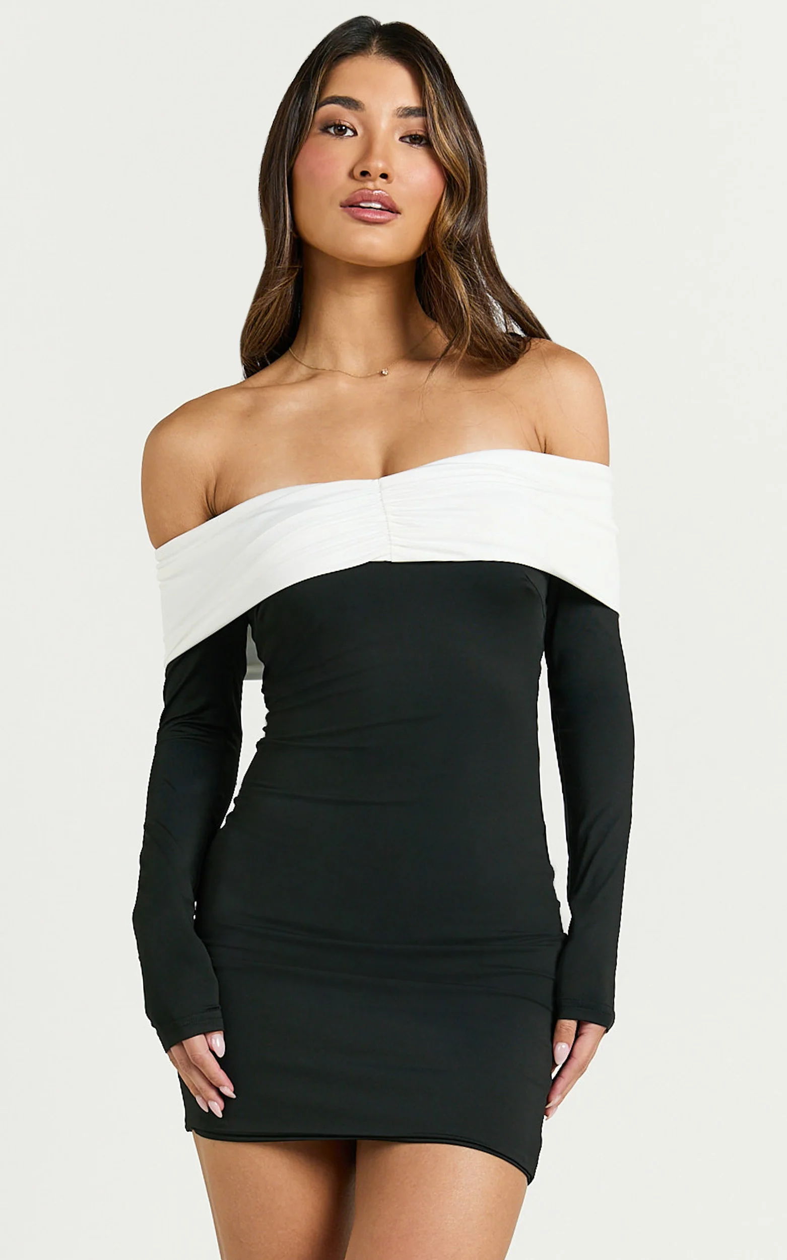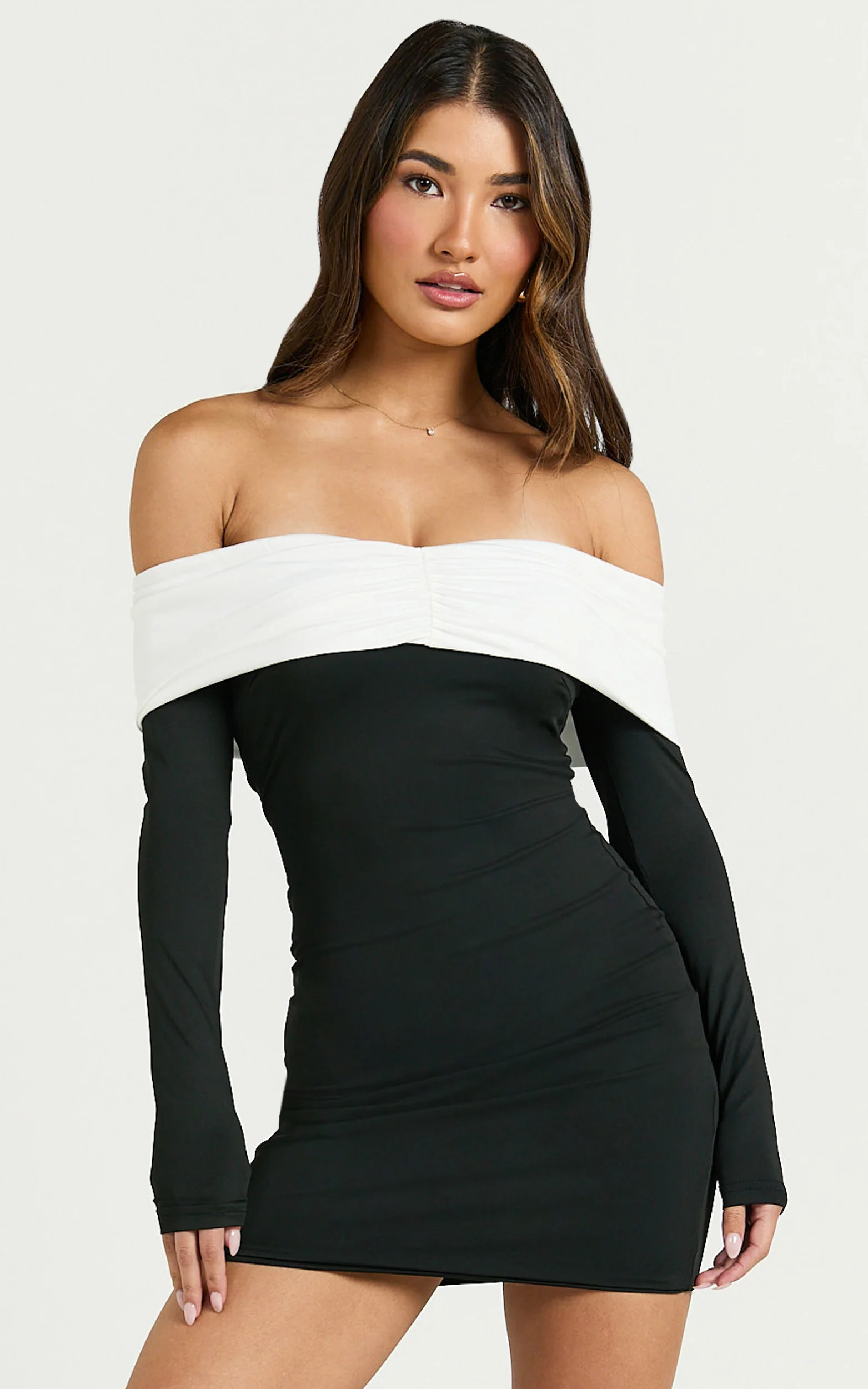Amalita Mini Dress - Off Shoulder Contrast Long Sleeve Dress in Black & White