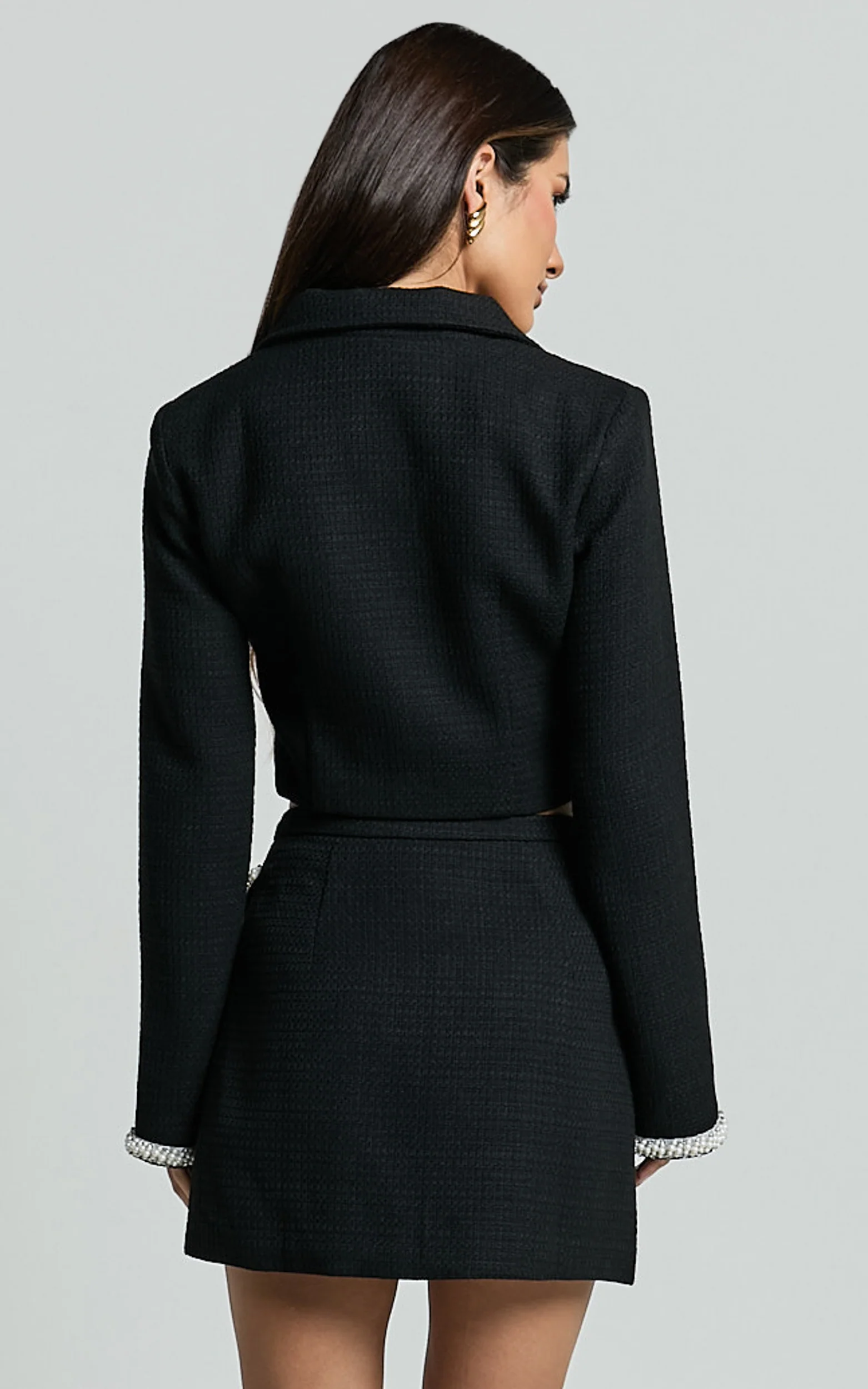Donatella Mini Skirt - Boucle Pearl Trim Side Split Mini Skirt in Black