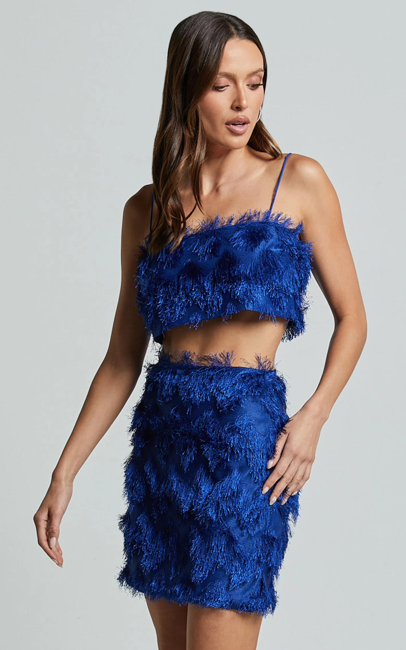 Shelby Mini Skirt - High Waist Fringe Skirt in Cobalt Blue