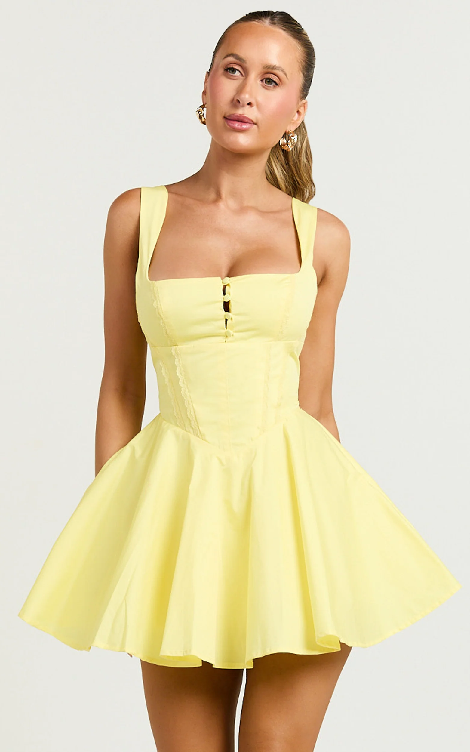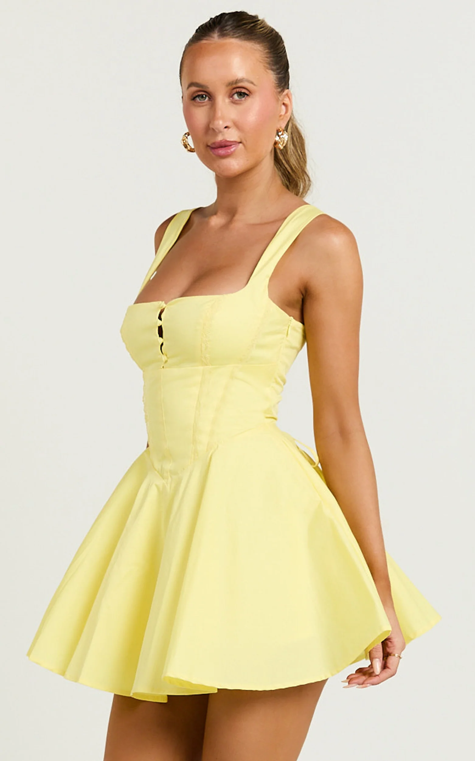 Indi Mini Dress - Square Neckline Lace Up Back Dress in Lemon