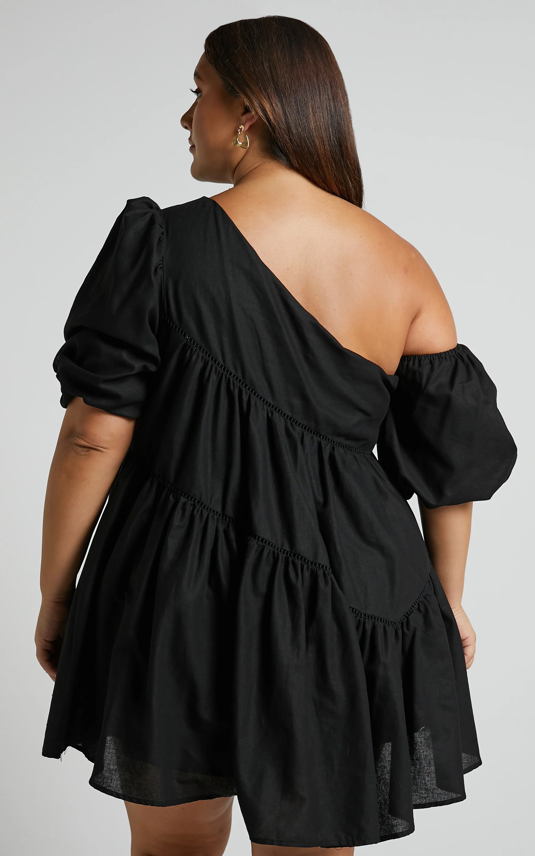 Harleen Mini Dress - Linen Asymmetrical Trim Puff Sleeve Dress in Black