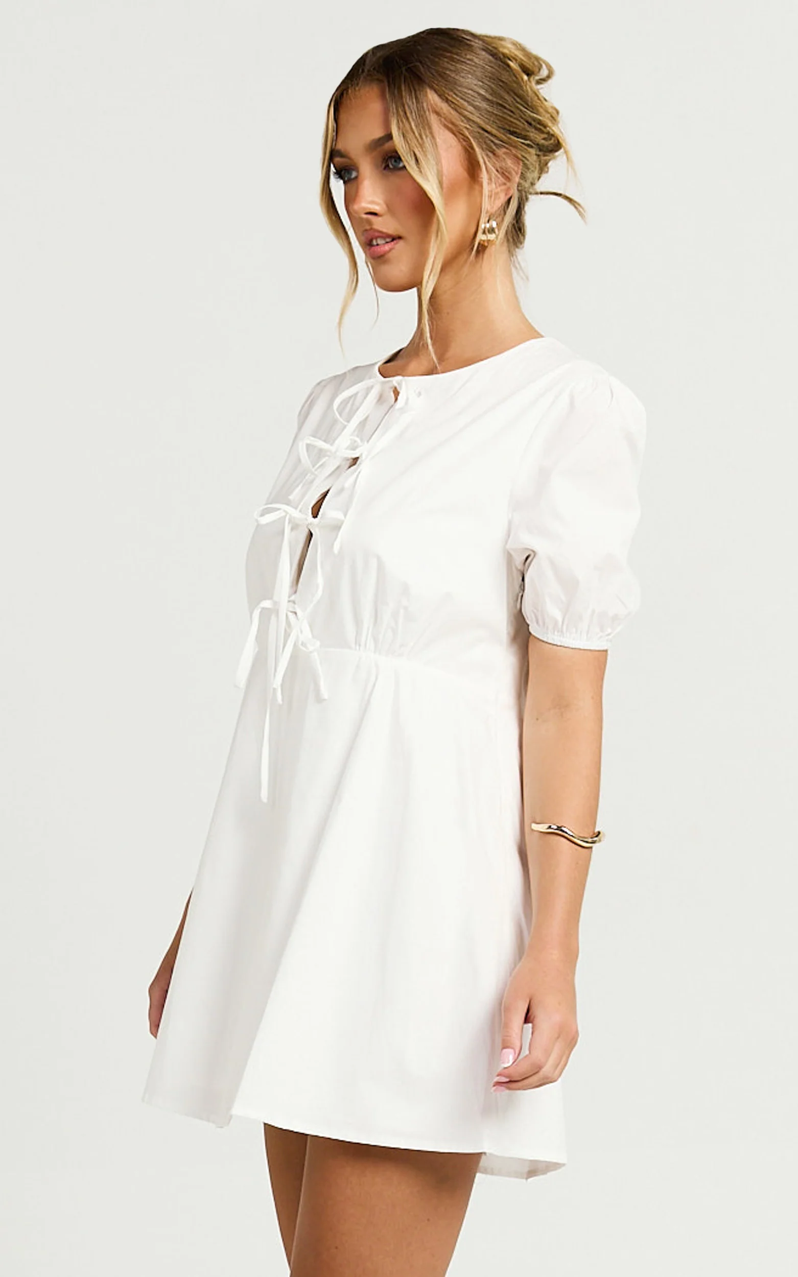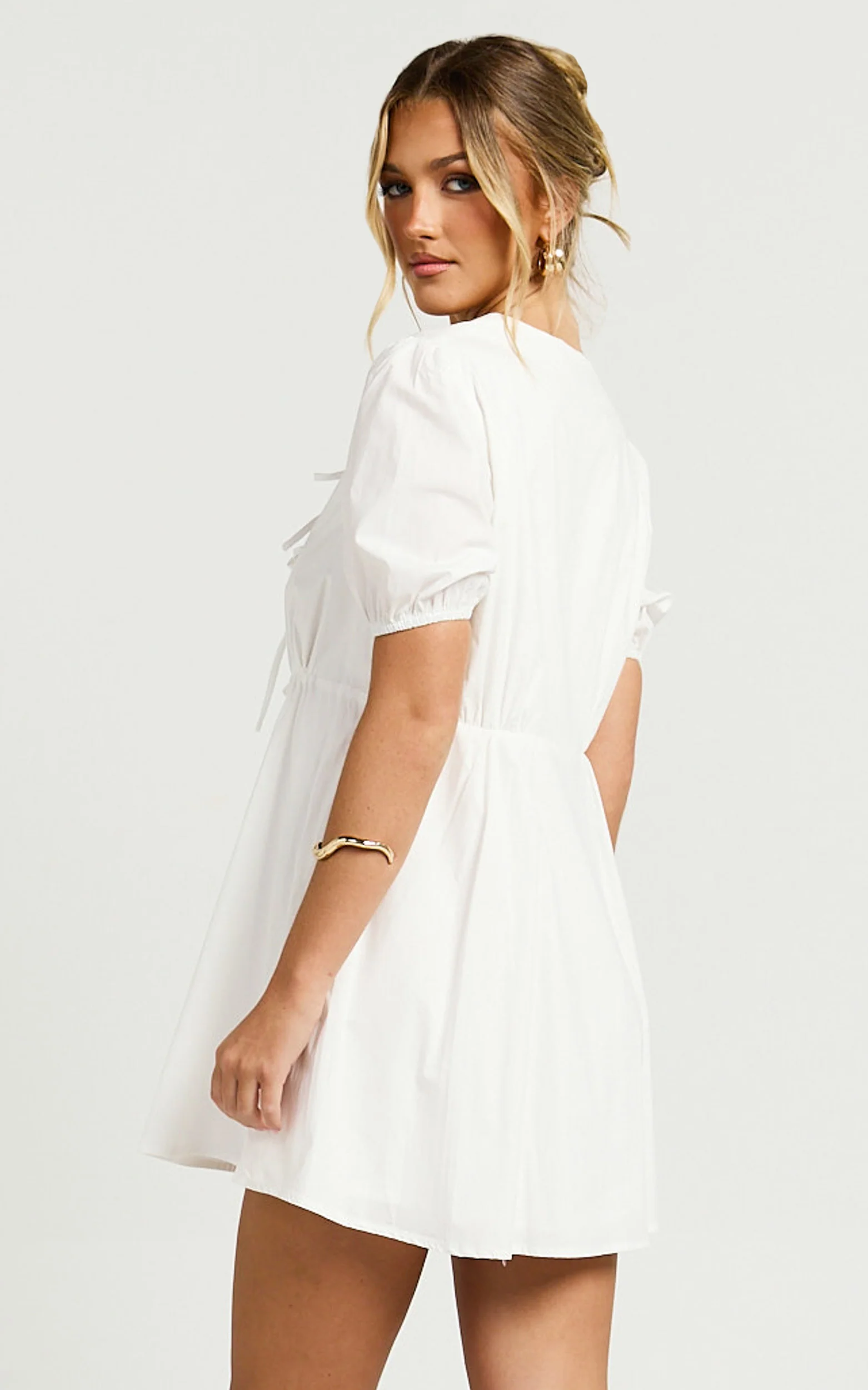 Hattie Mini Dress - Tie Front Puff Sleeve Dress in White