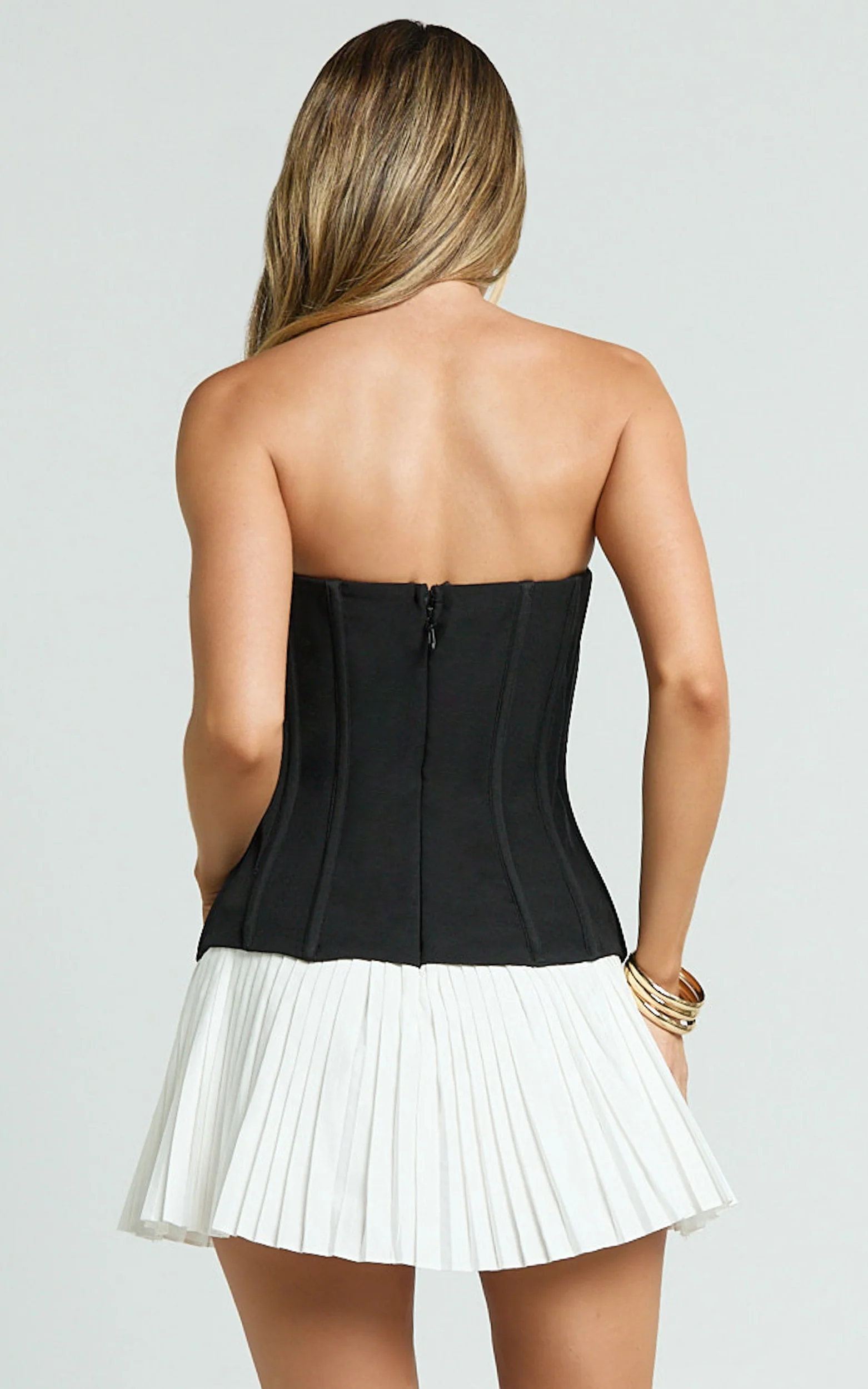 Deb Mini Dress - Strapless Sweetheart Contrast Bodice Pleated Dress in White/Black