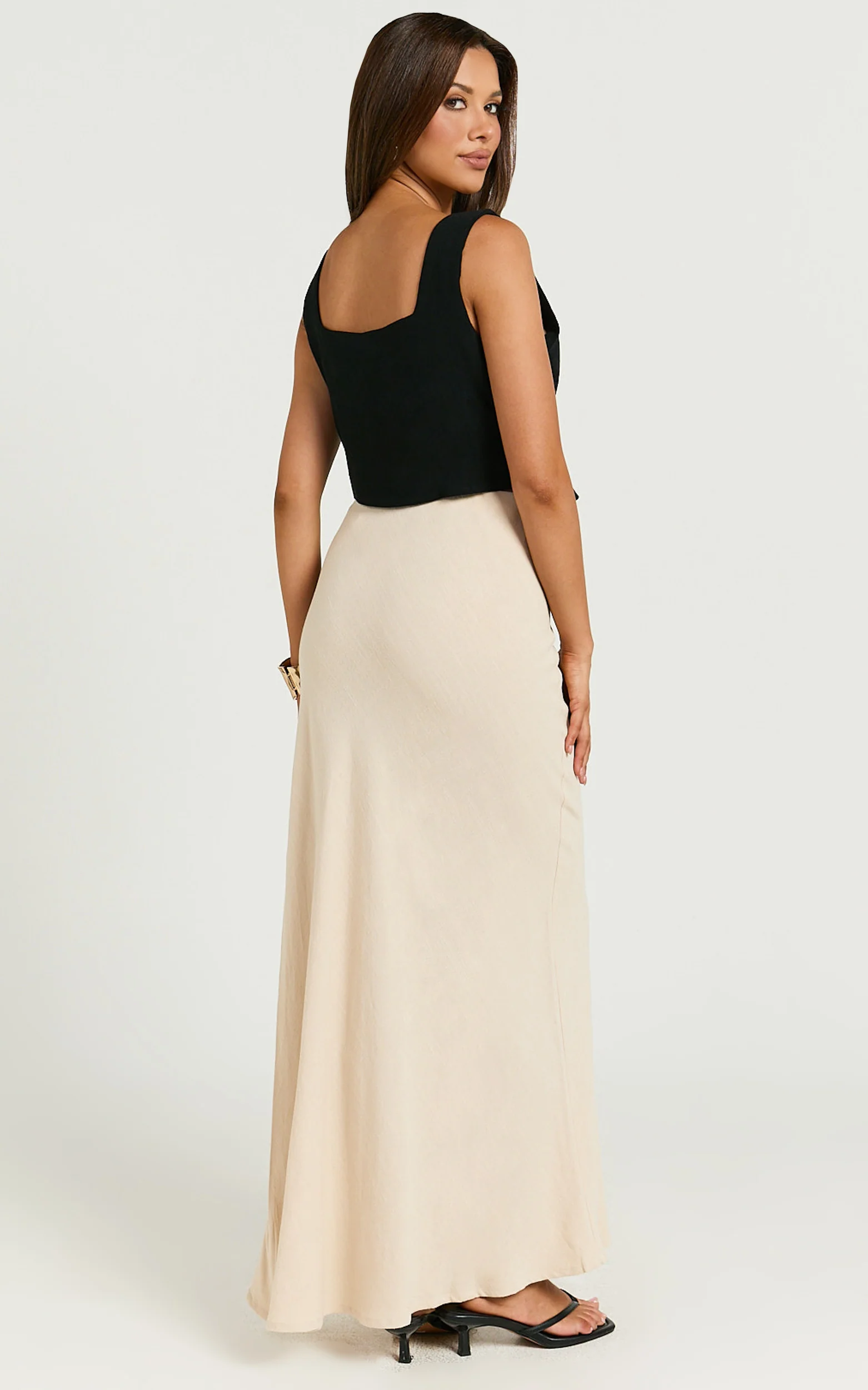 Olivia Maxi Skirt - Mid Waisted Linen Bias Cut Split Skirt in Natural
