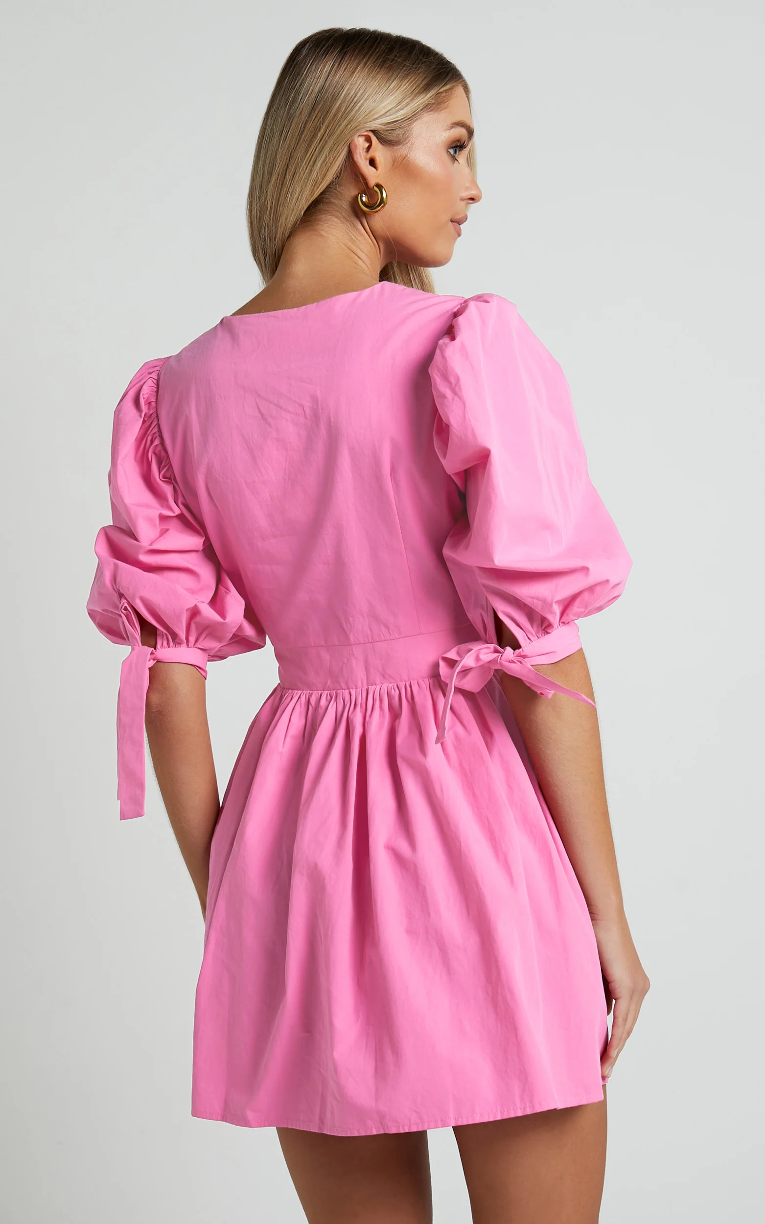 Zandra Mini Dress - Puff Sleeve Poplin Dress in ICE PINK