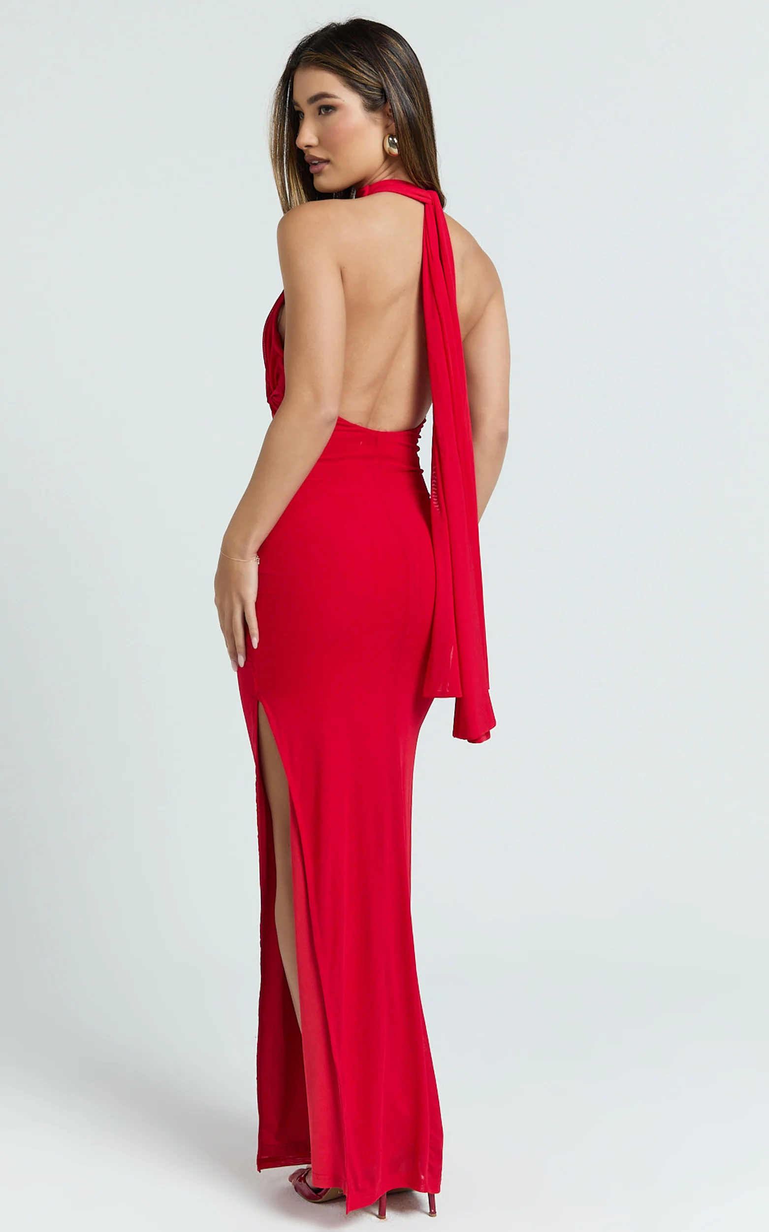 Francis Maxi Dress - Halter Ruched Backless Dress in Red