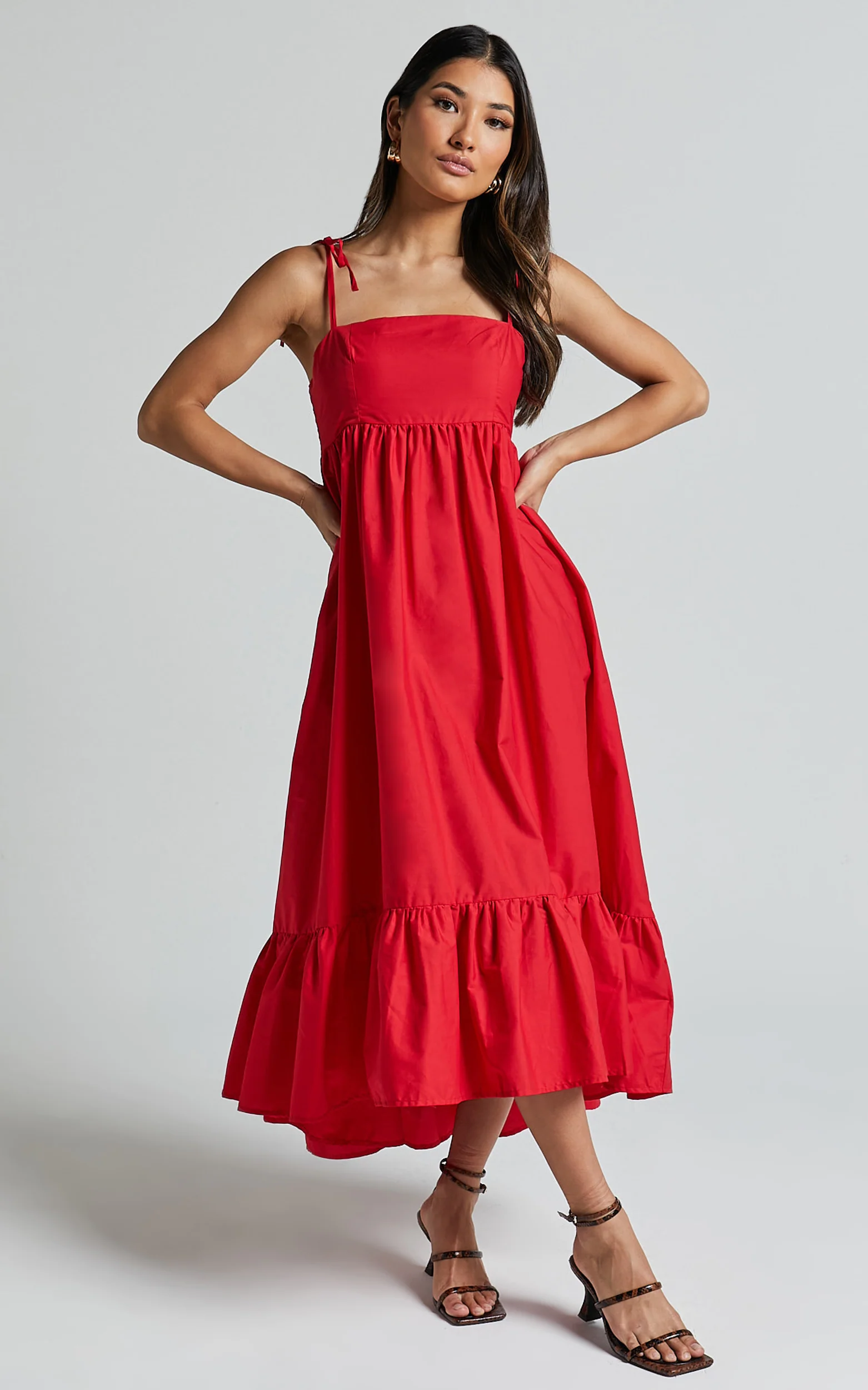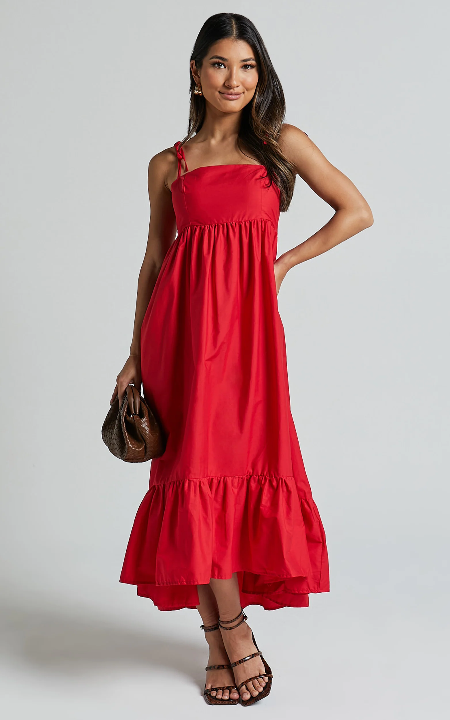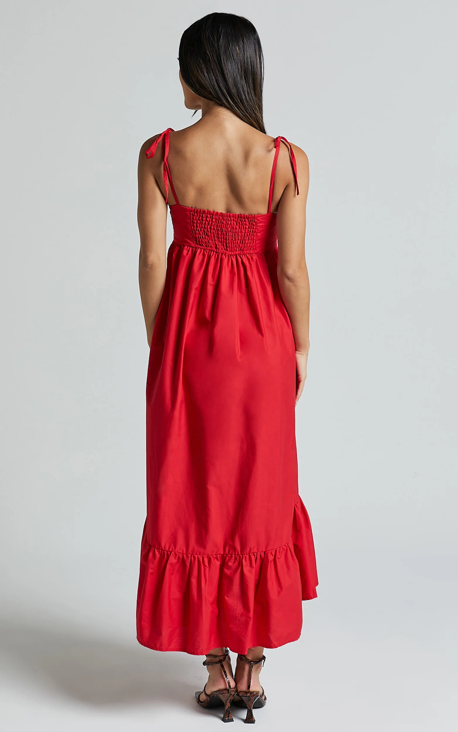 Aveiro Midi Dress - Straight Neck Shoulder Tie High Low Ruffle Hem in Red