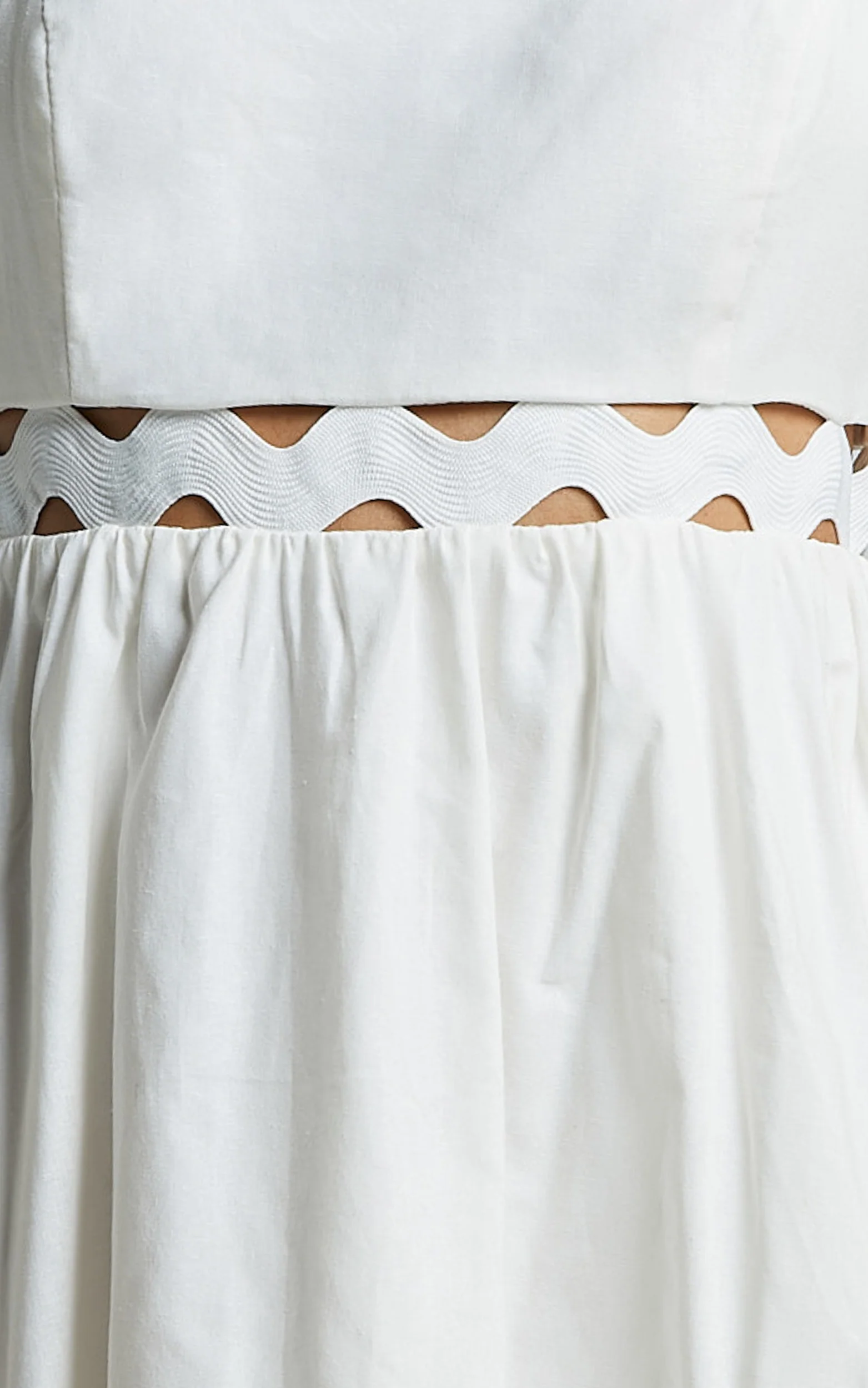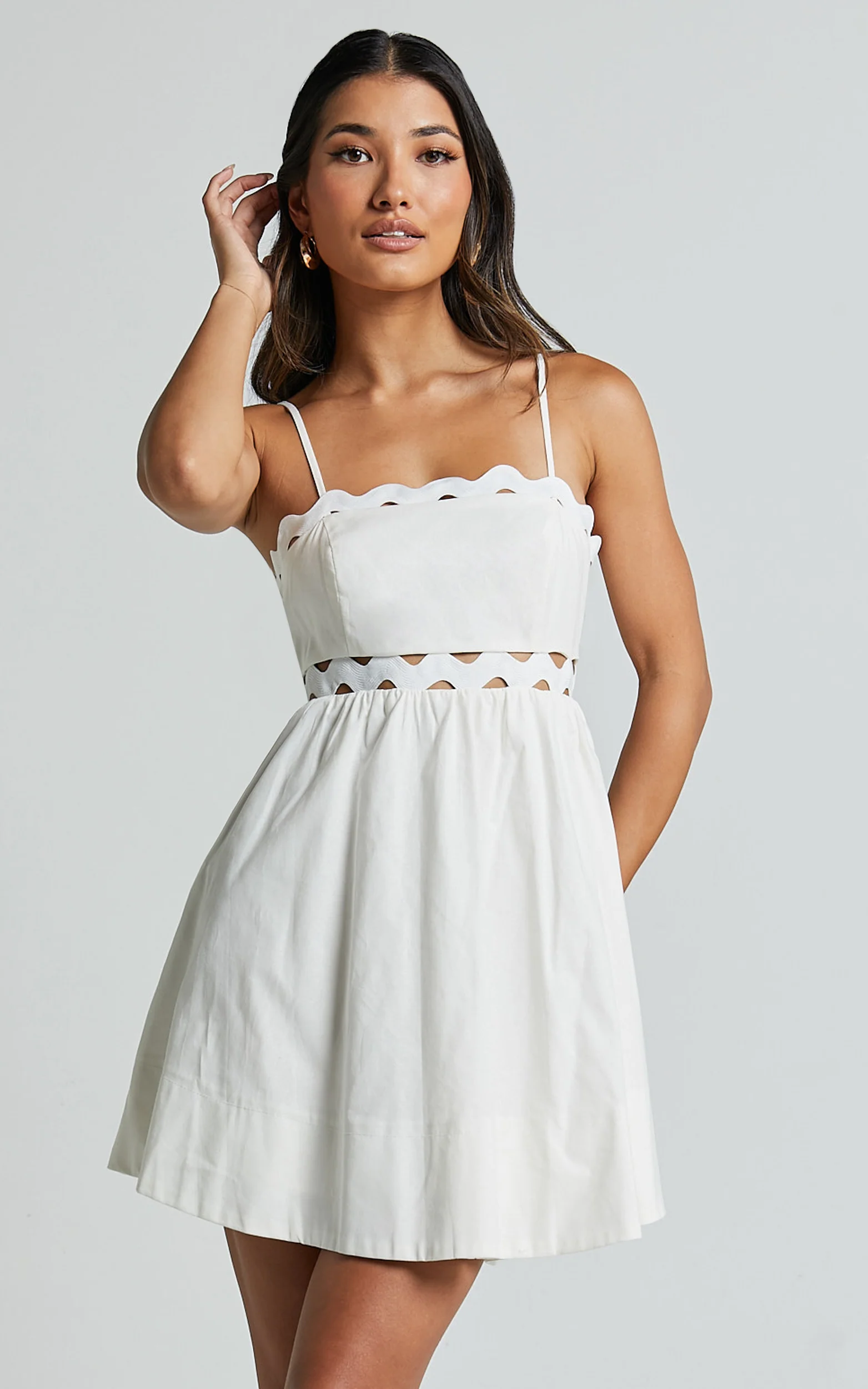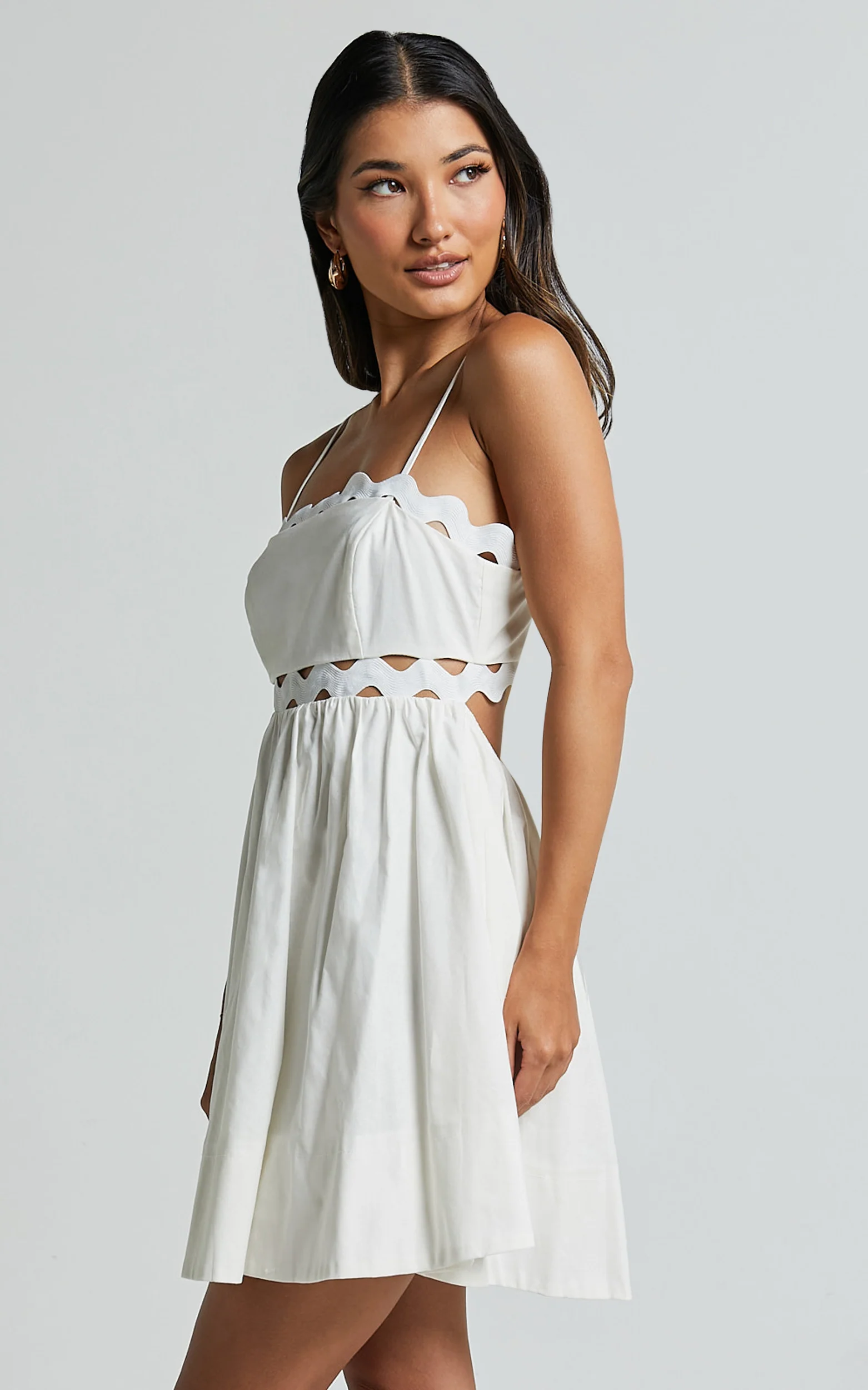 Brylee Mini Dress - Strappy Wave Neck Pleated Dress in White