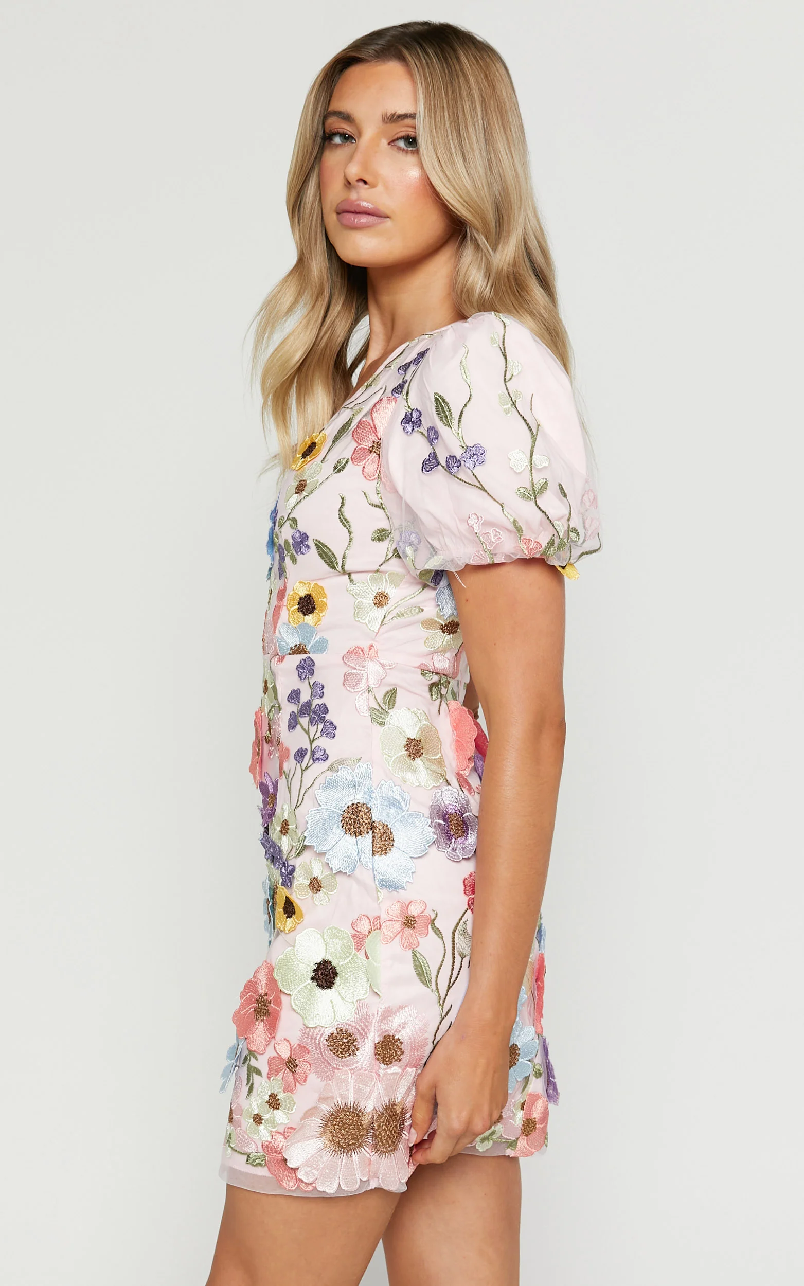 Wren Mini Dress - Puff Sleeve Bodycon 3d Garden Flowers Dress in Pink