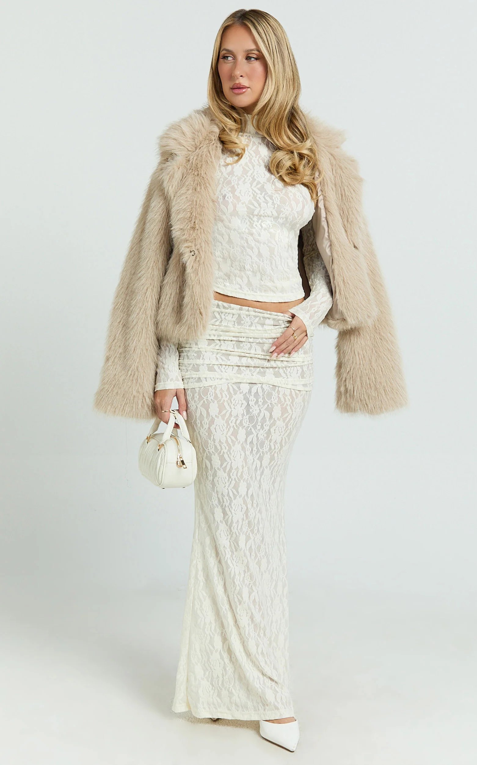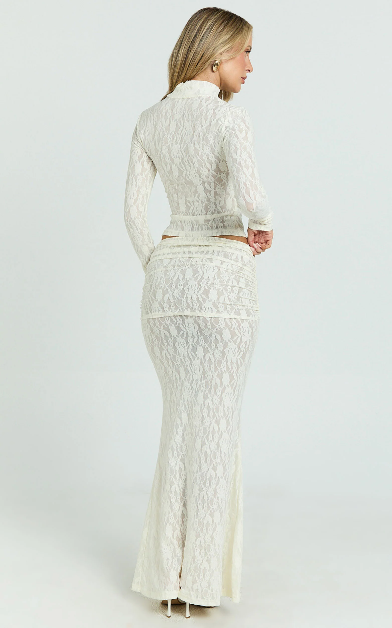 Kathleen Maxi Skirt - Mid Rise Ruched Wide Band Fishtail Jersey Skirt in Cream