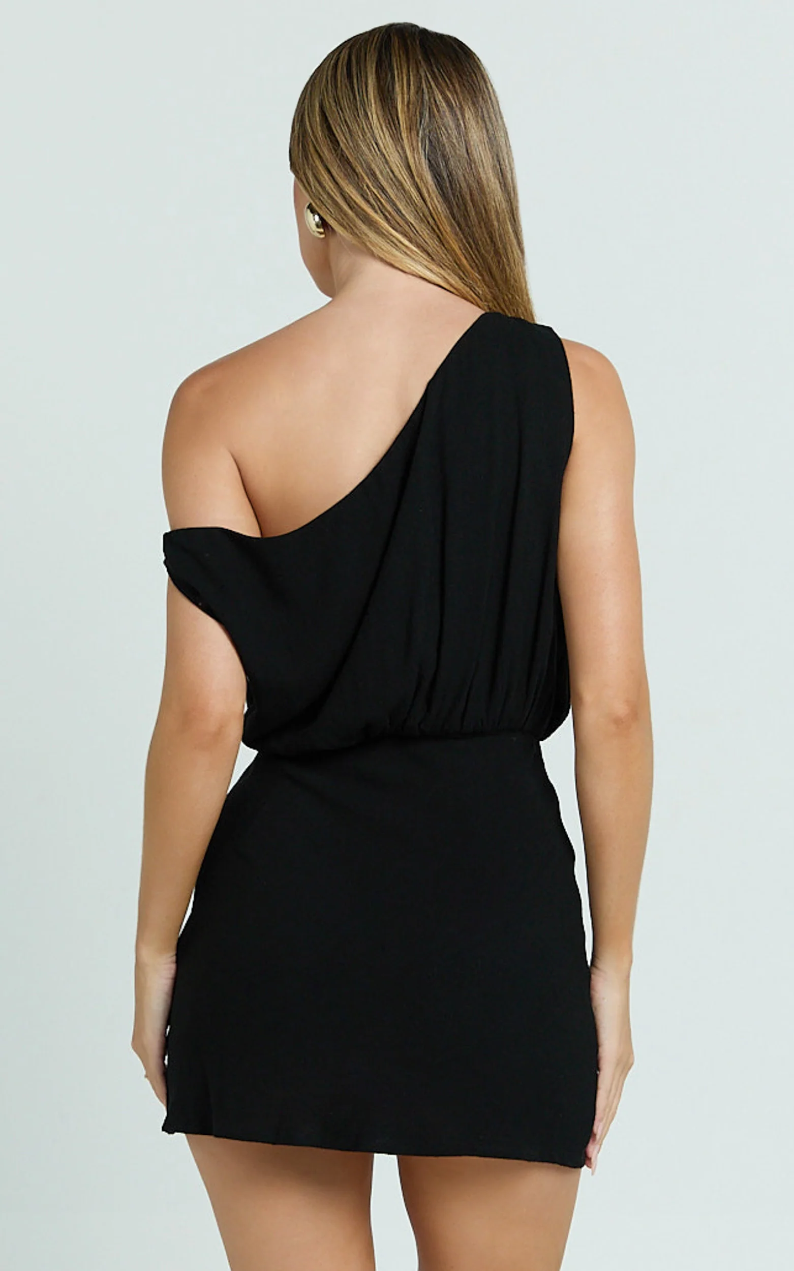Nellie Mini Linen Dress - Linen One Shoulder Mini Dress in Black