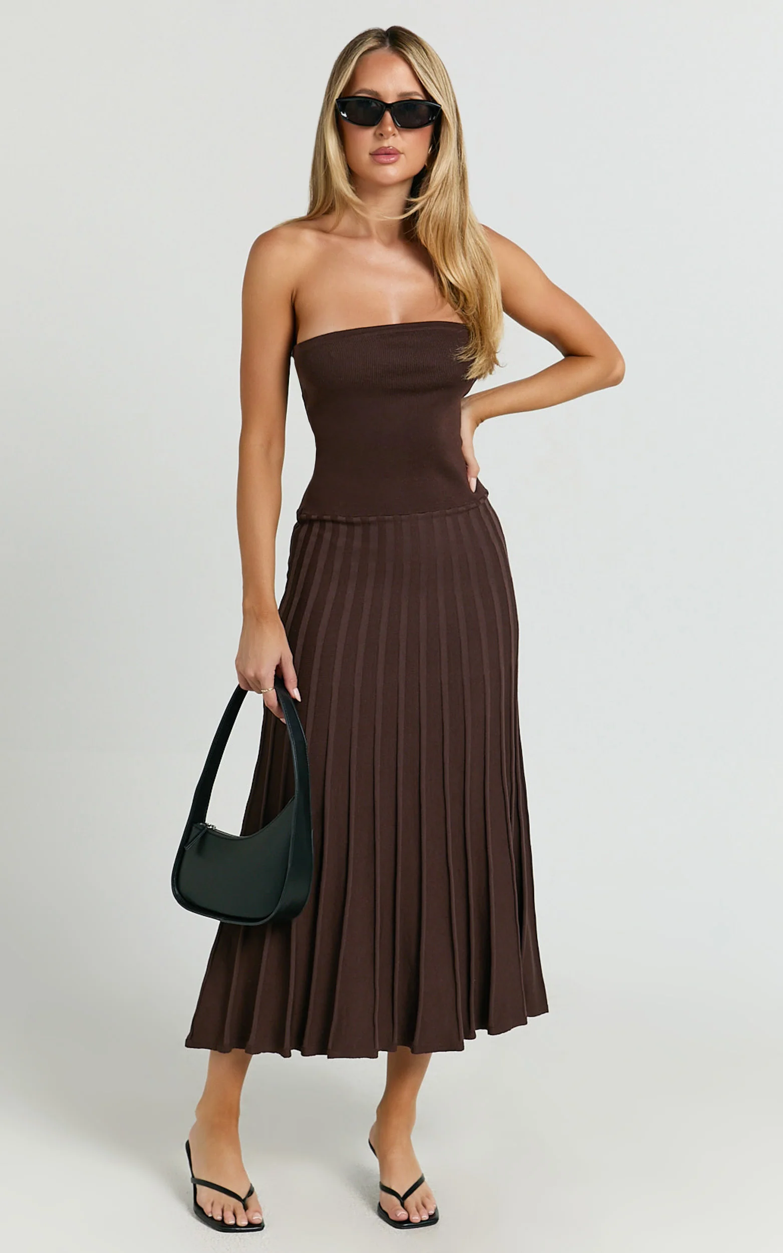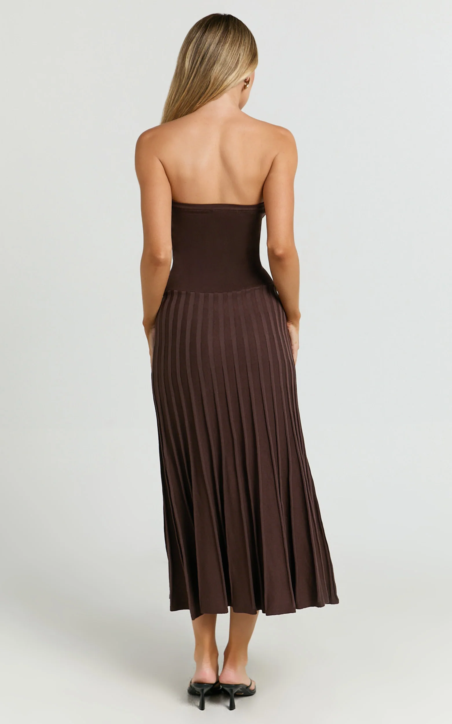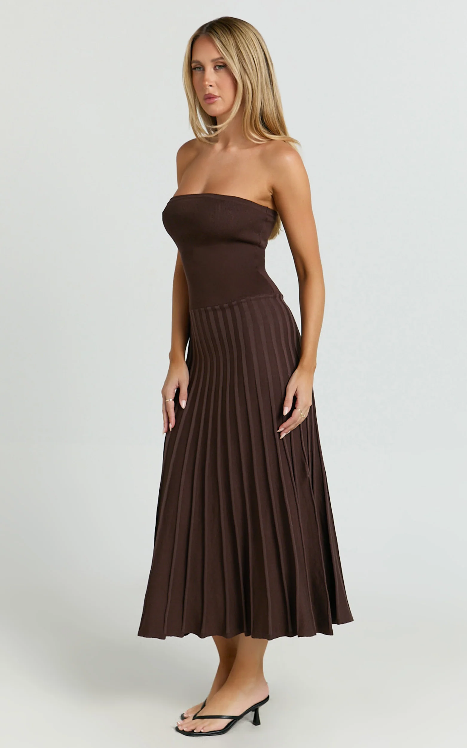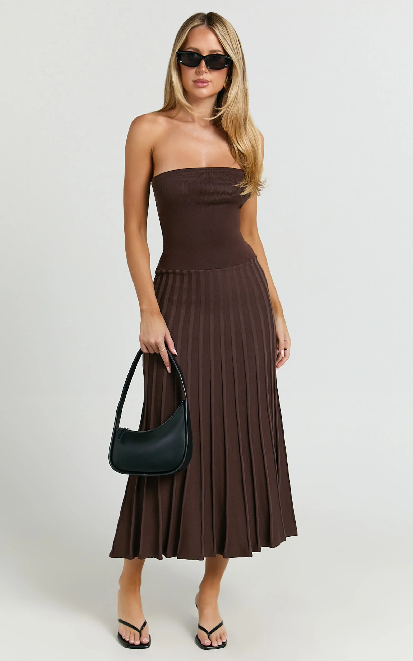 Paris Midi Dress - Strapless Drop Waist Pleated Knit Dress in Chocolate