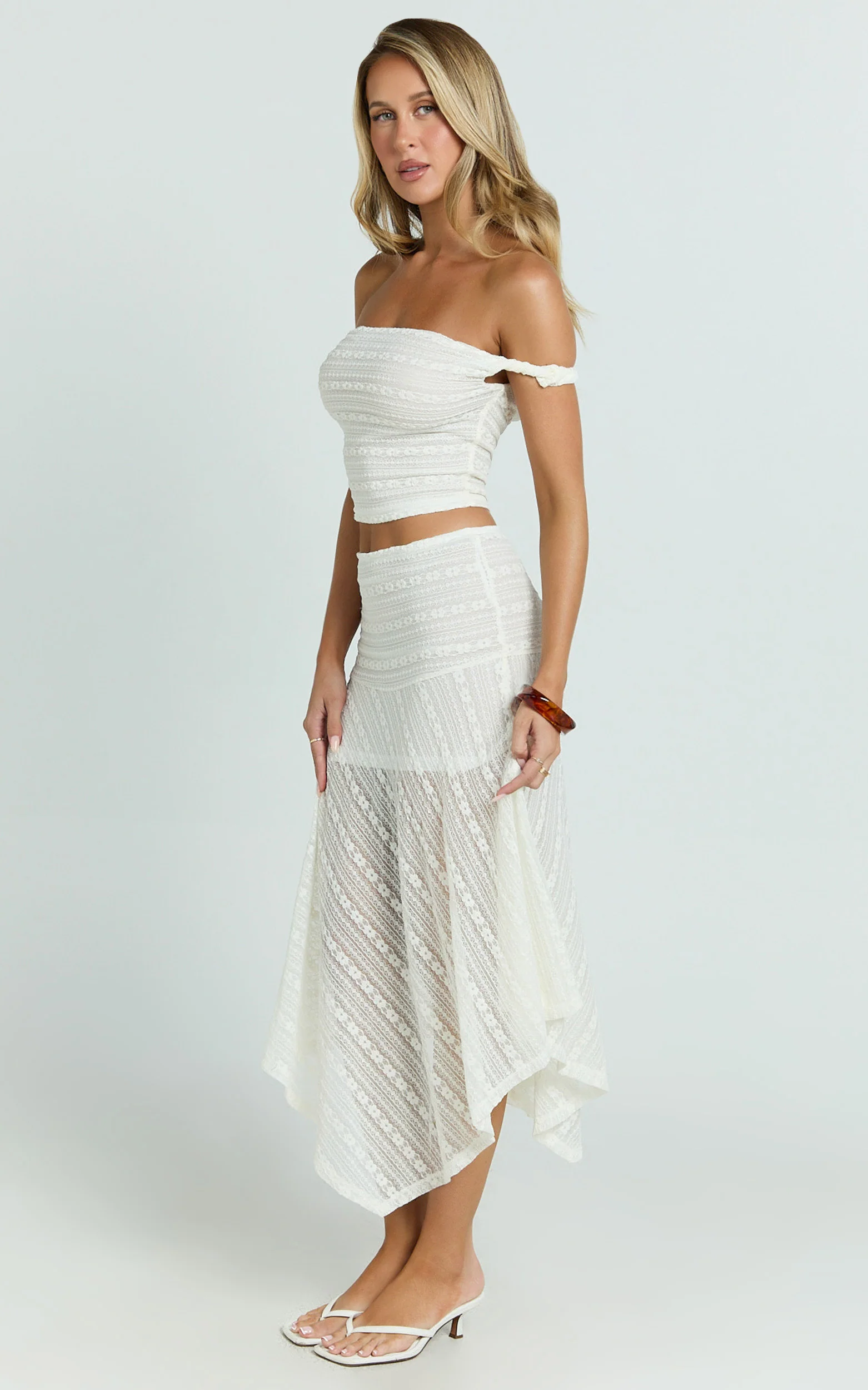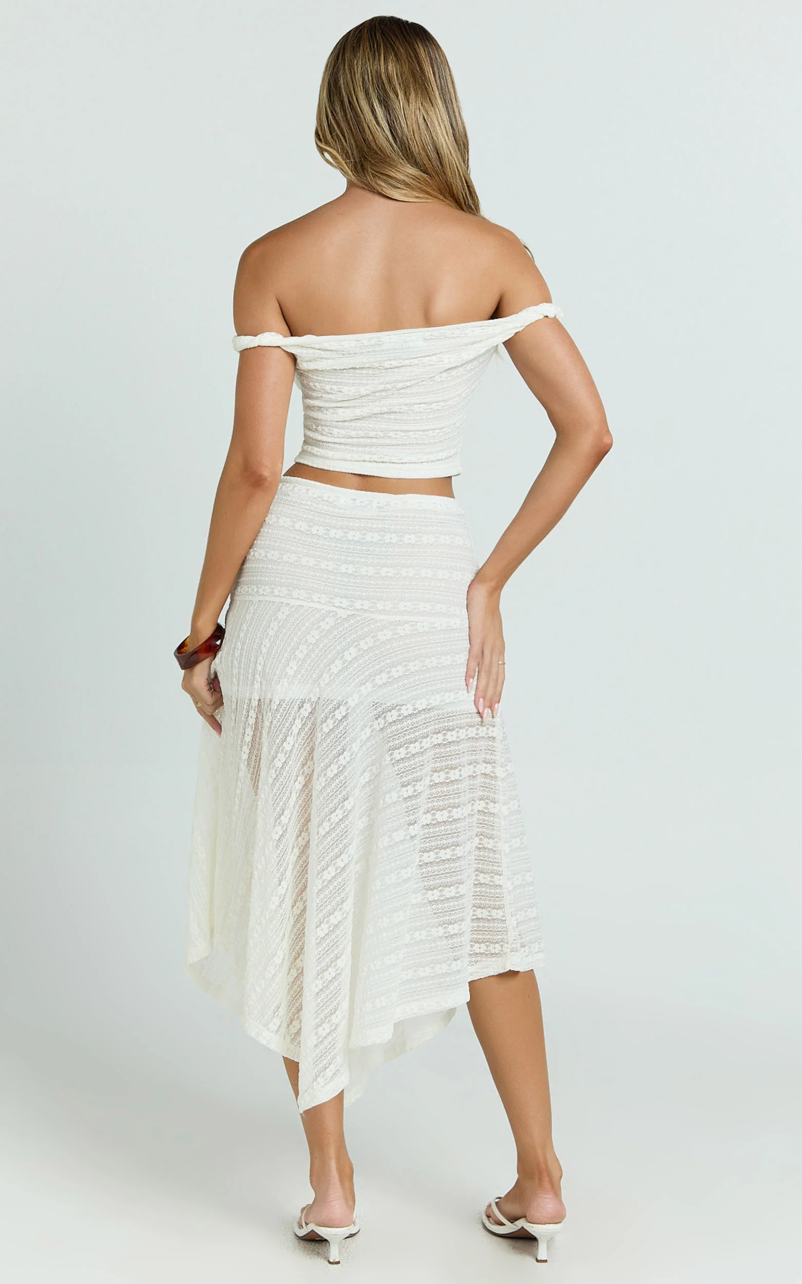 Hayden Midi Skirt - Low Waisted Asymmetrical Lace Midi Skirt in White