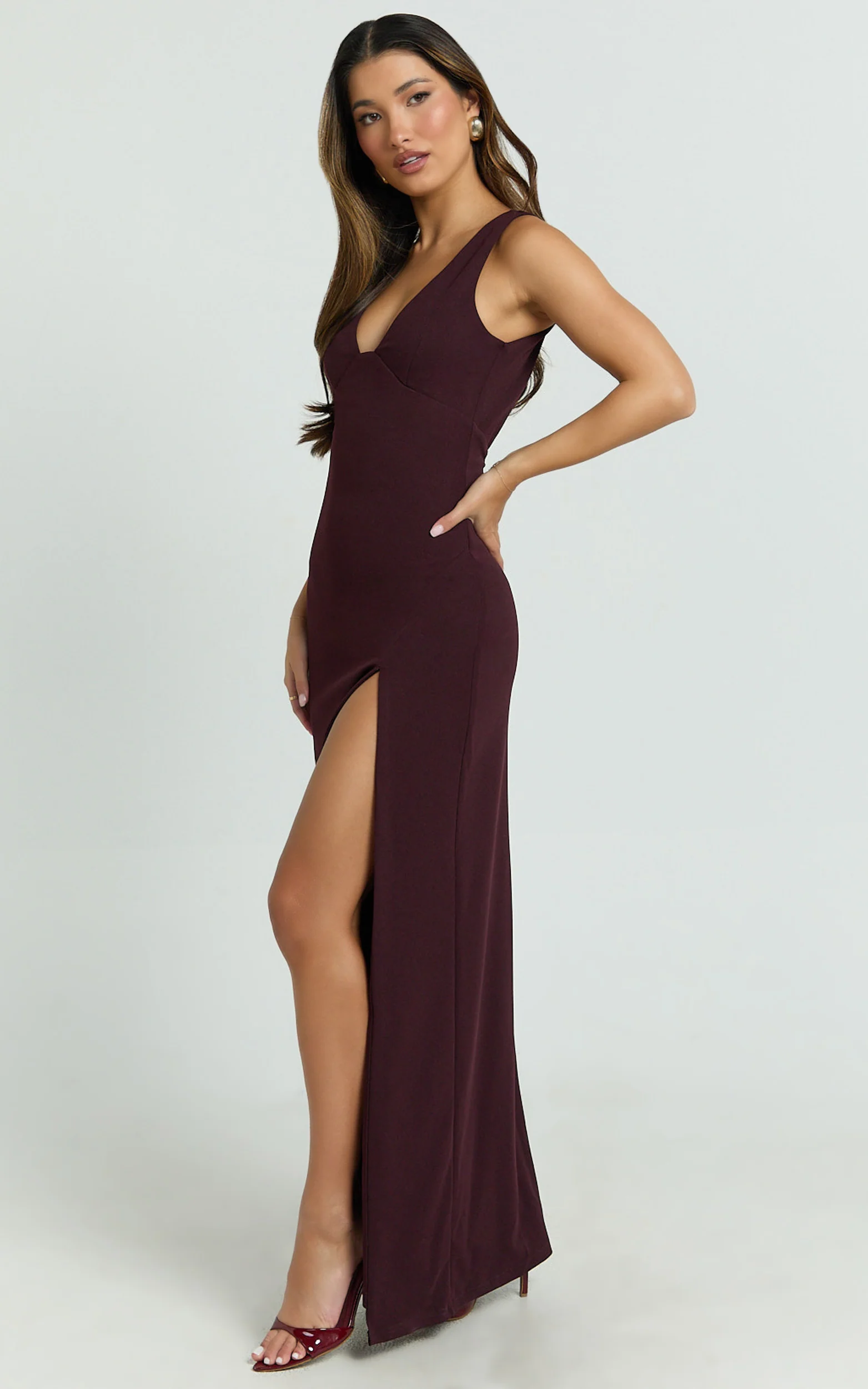 Raya Maxi Dress - Deep V Neck Low Back Bodycon Dress in Wine