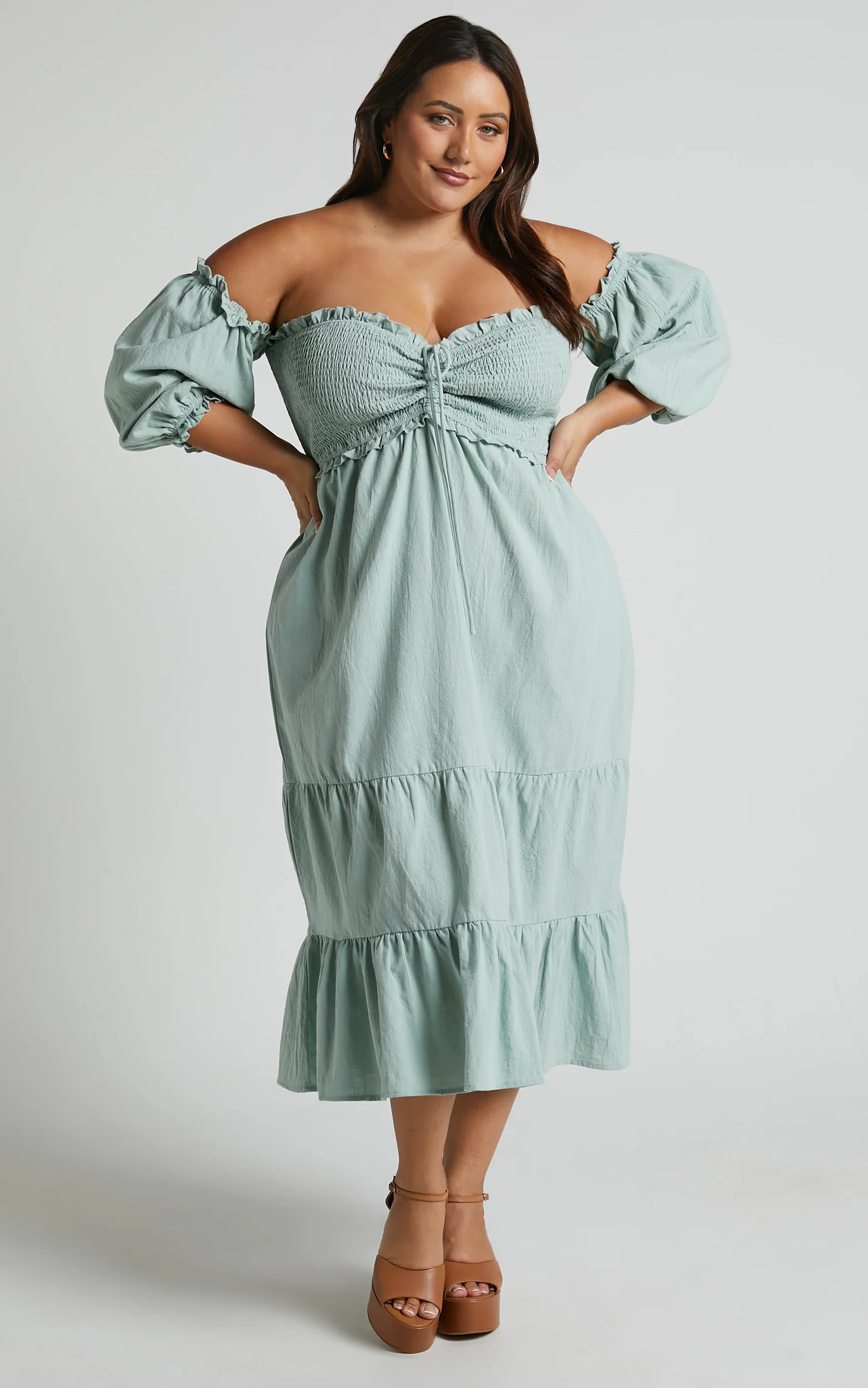 Nikka Midi Linen Blend Dress - Shirred Off Shoulder Puff Sleeve Dress in Sage