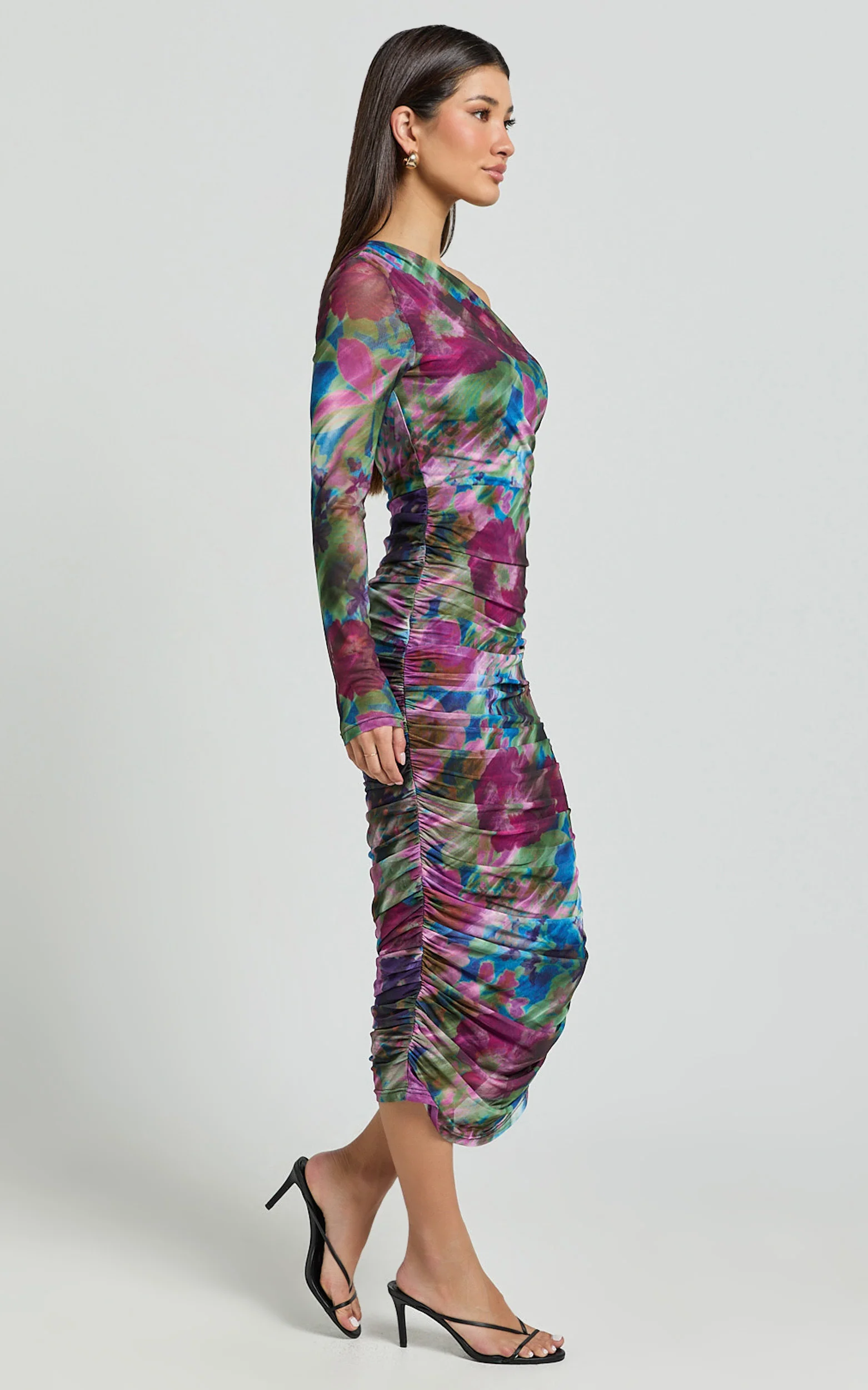 Pepper Midi Dress - One Shoulder Ruched Mesh Dress in Ethereal Iris Print