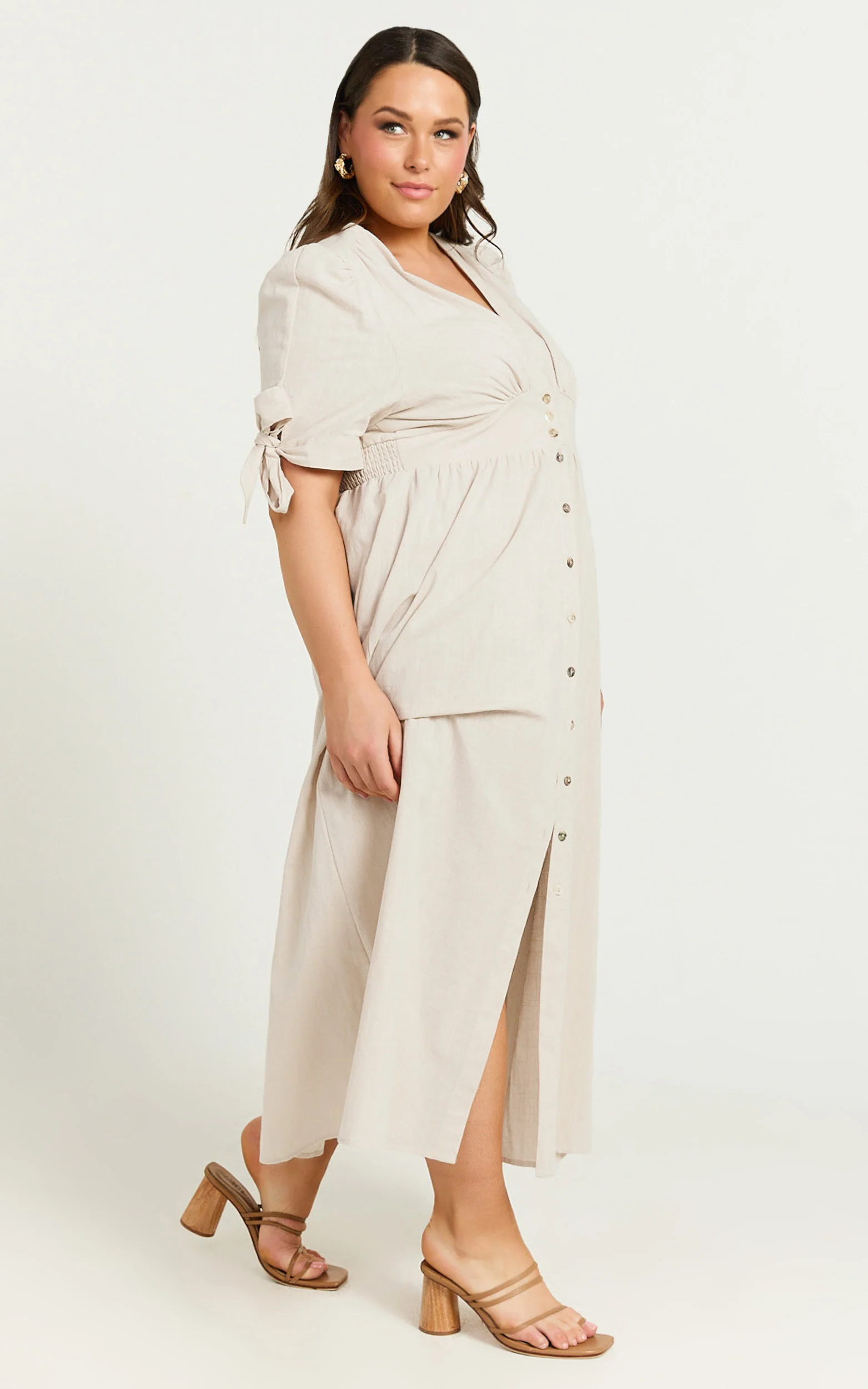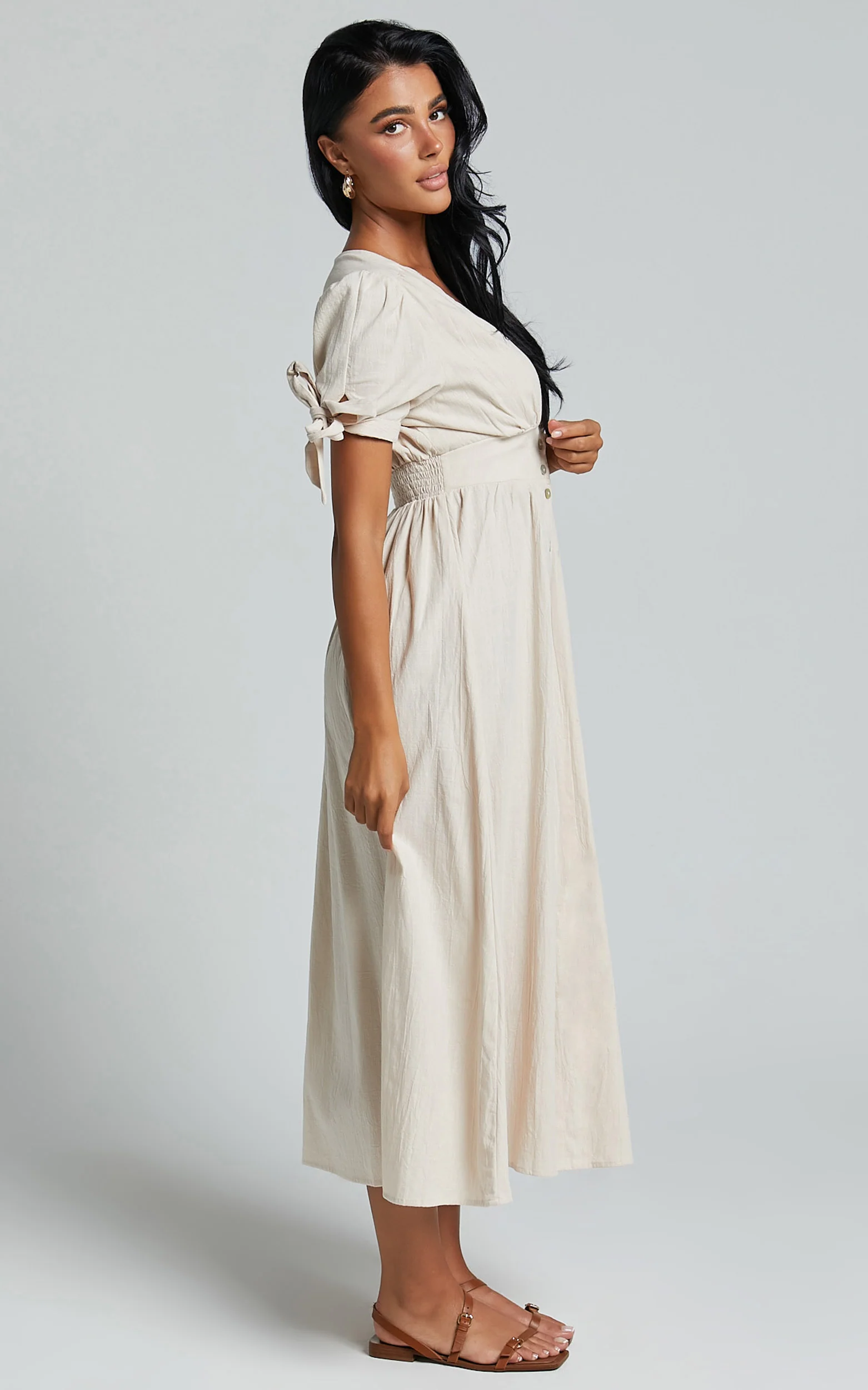 Avegail Midi Dress - V Neck Button Through Short Sleeve Dress in Bone