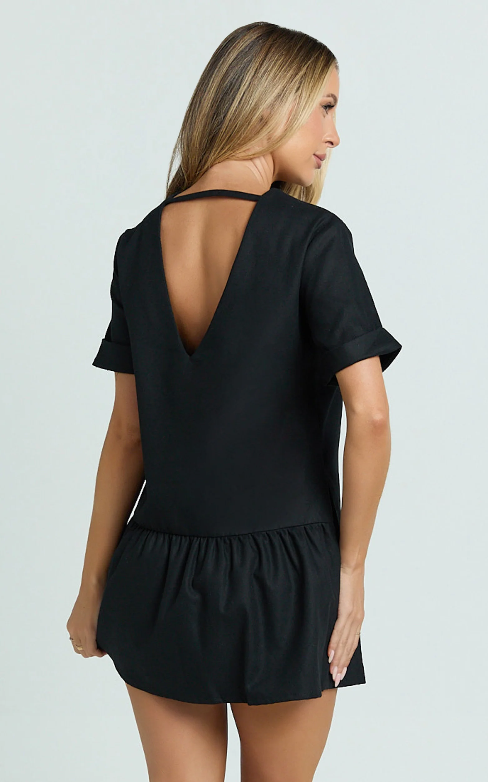 Lyons Mini Dress - High Neck Short Sleeve Drop Waist Gathered Skirt Dress in Black