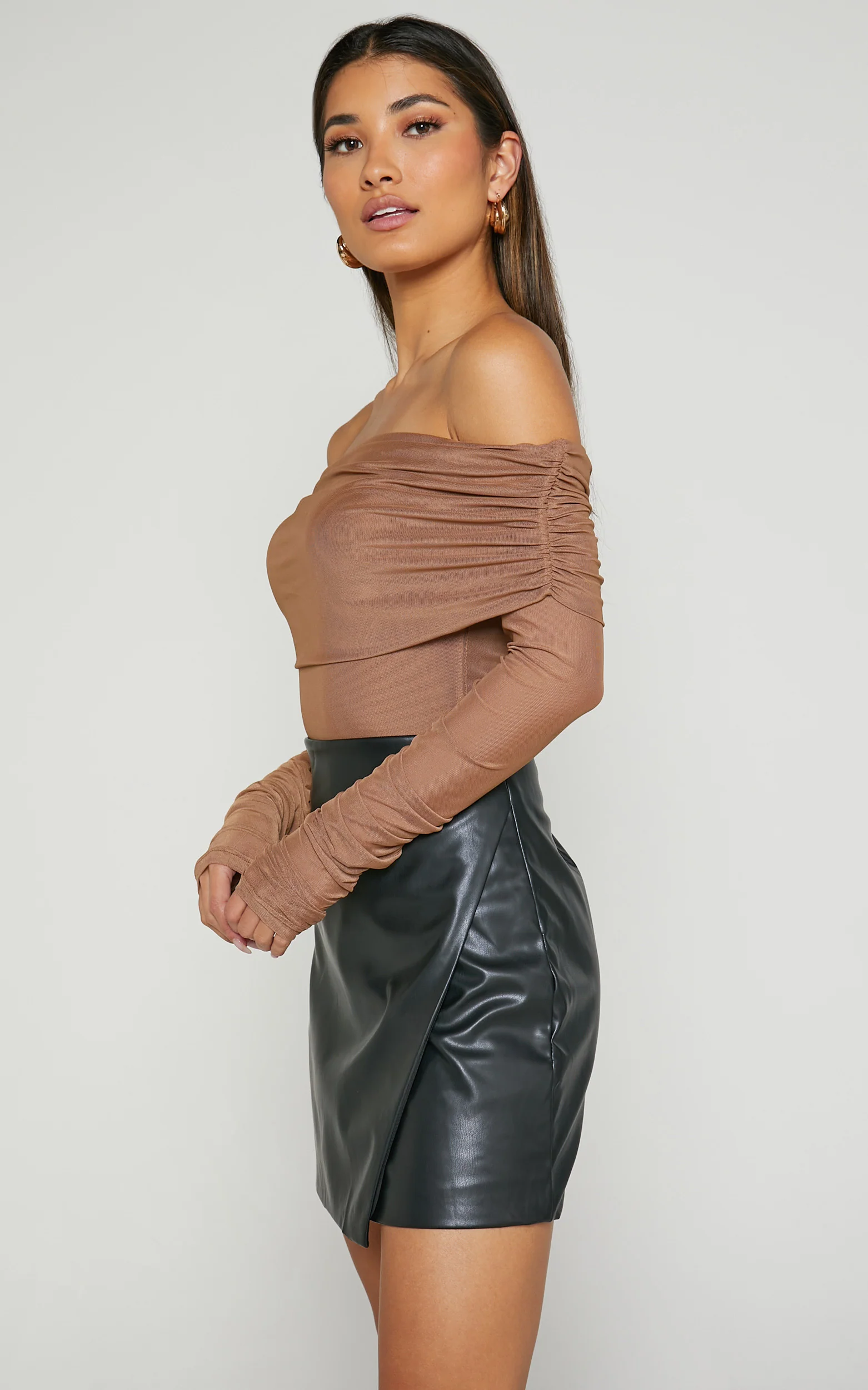 Jaythen Bodysuit - Long Sleeve Off Shoulder Ruched Mesh Bodysuit in Mocha