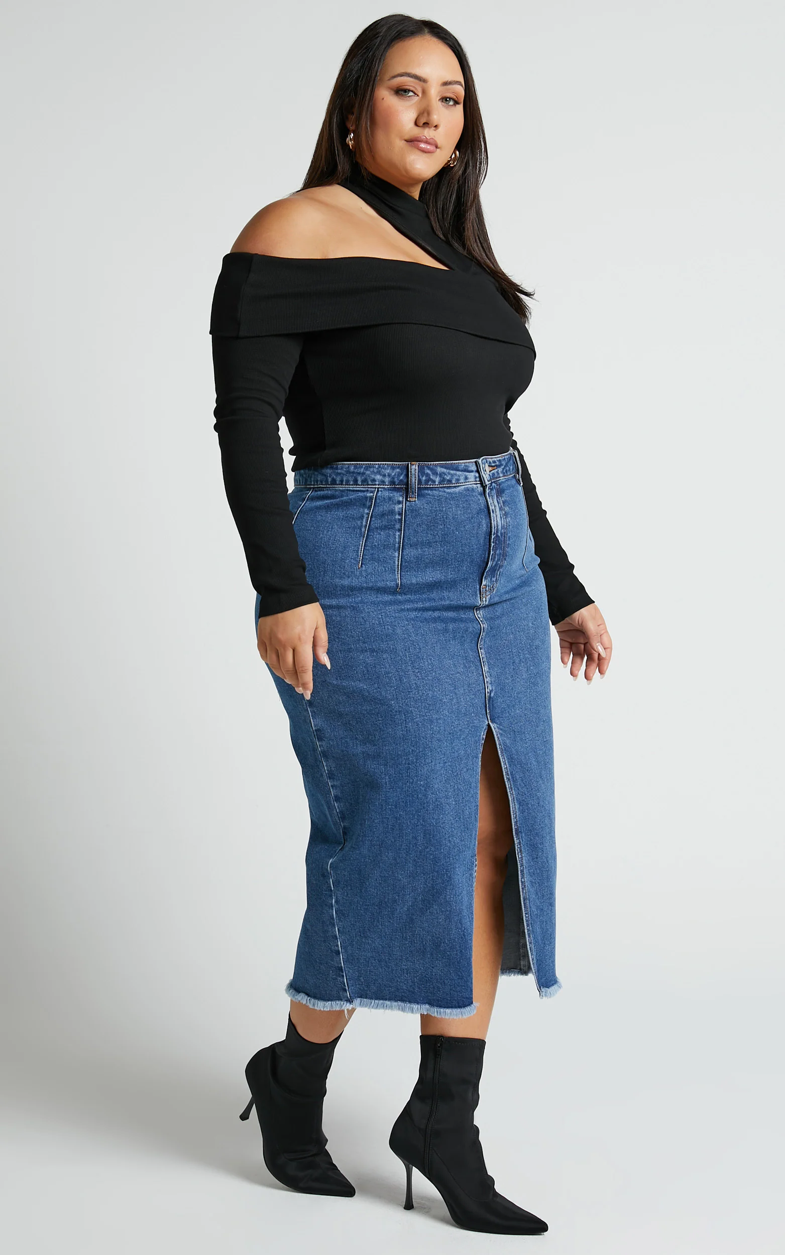 Janeve Midi Skirt - Front Split Denim Skirt in Dark Blue