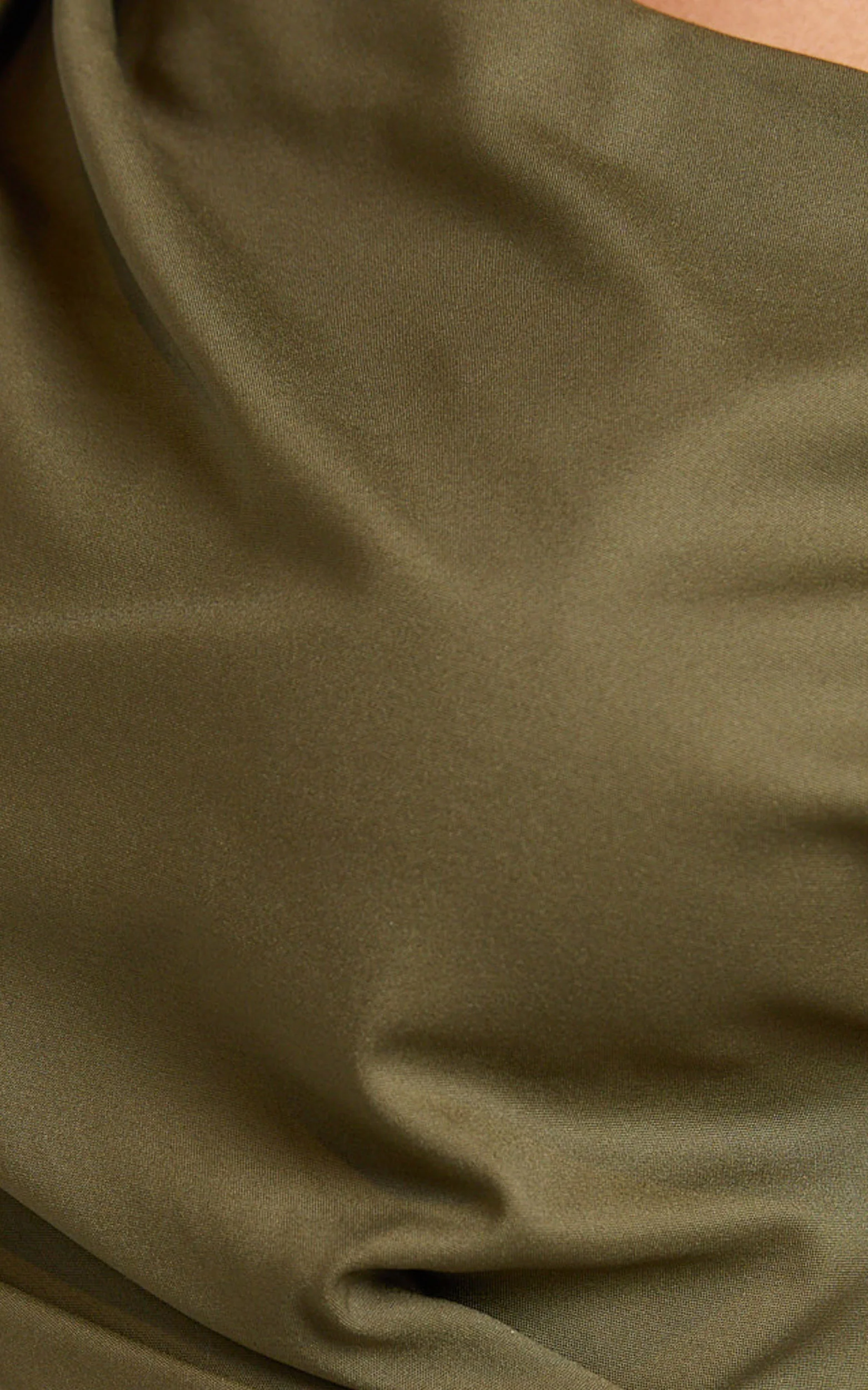 Alexandria Midi Dress - Tip Shoulder Draped Fitted Dress in Olive
