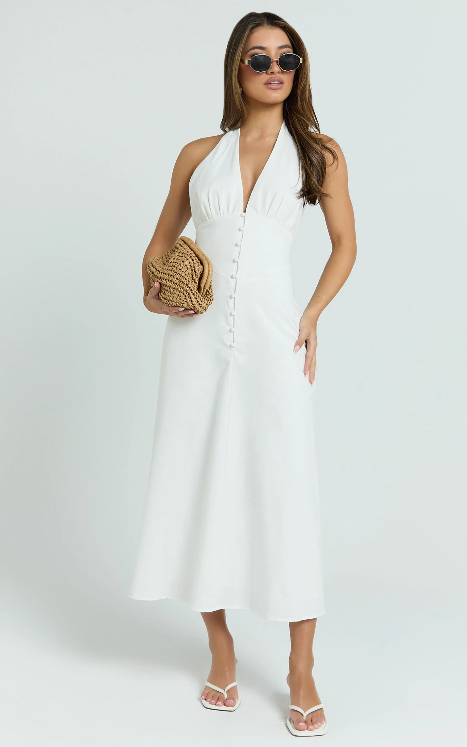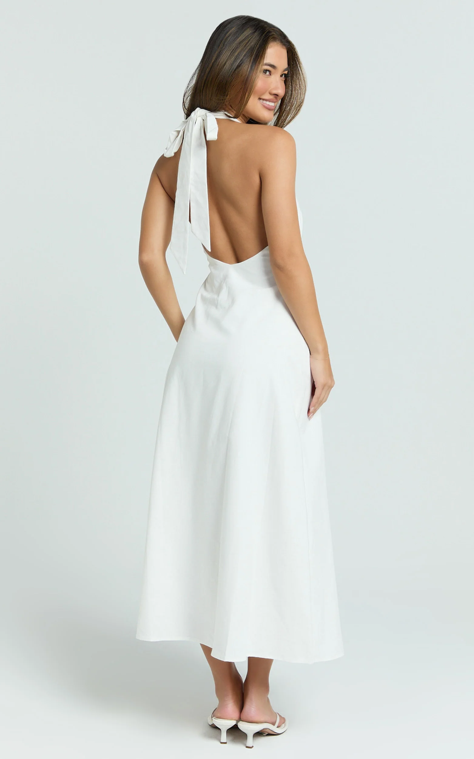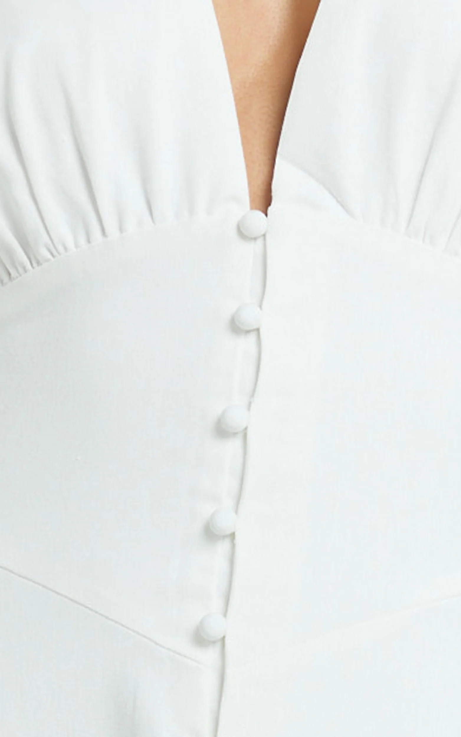 Quinn Midi Linen Blend Dress - Puff Sleeve Square Neck Dress in Red