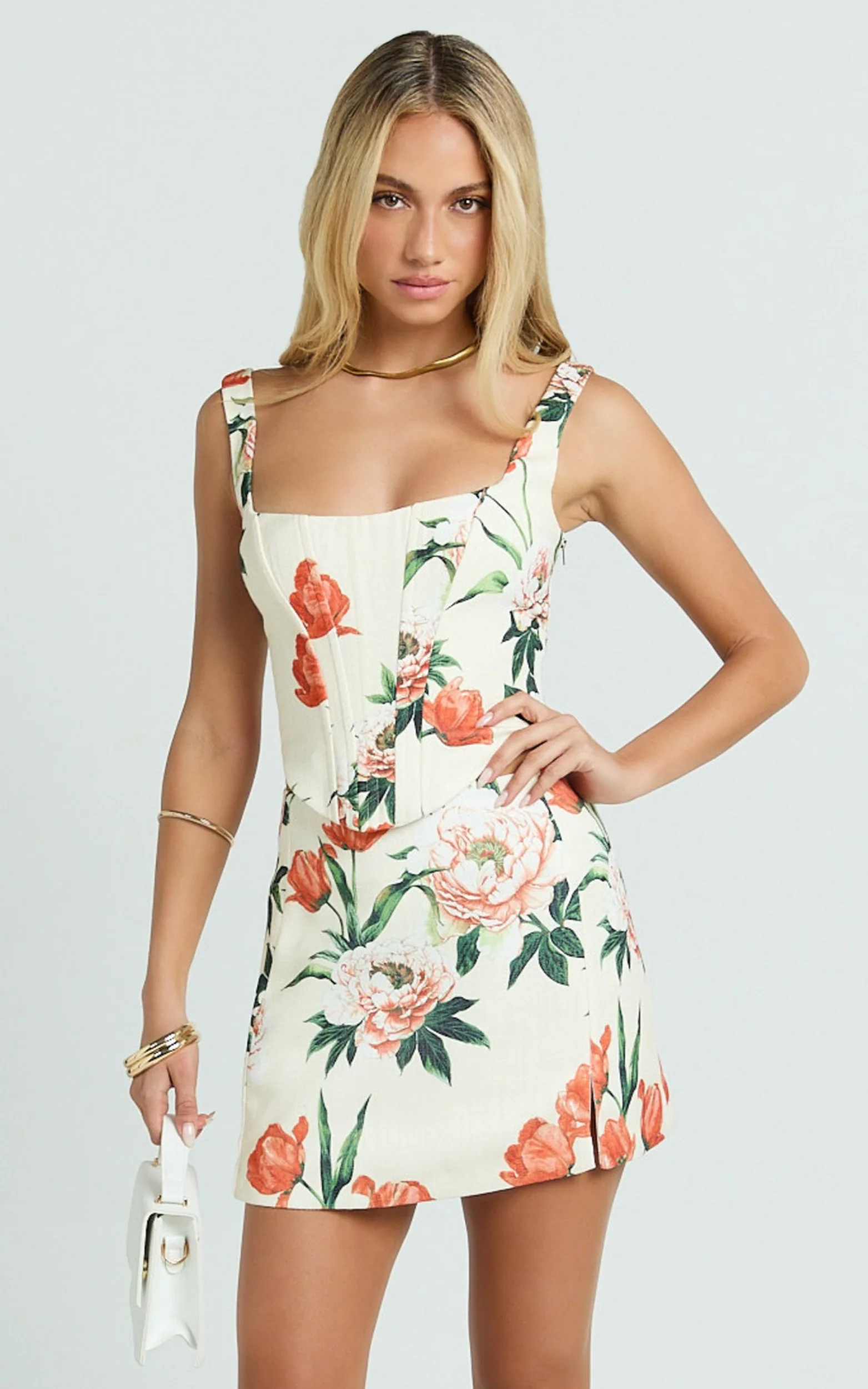 Tracey Mini Skirt - Floral Print Mid Rise Fitted Leg Split Skirt in Rustic Floral