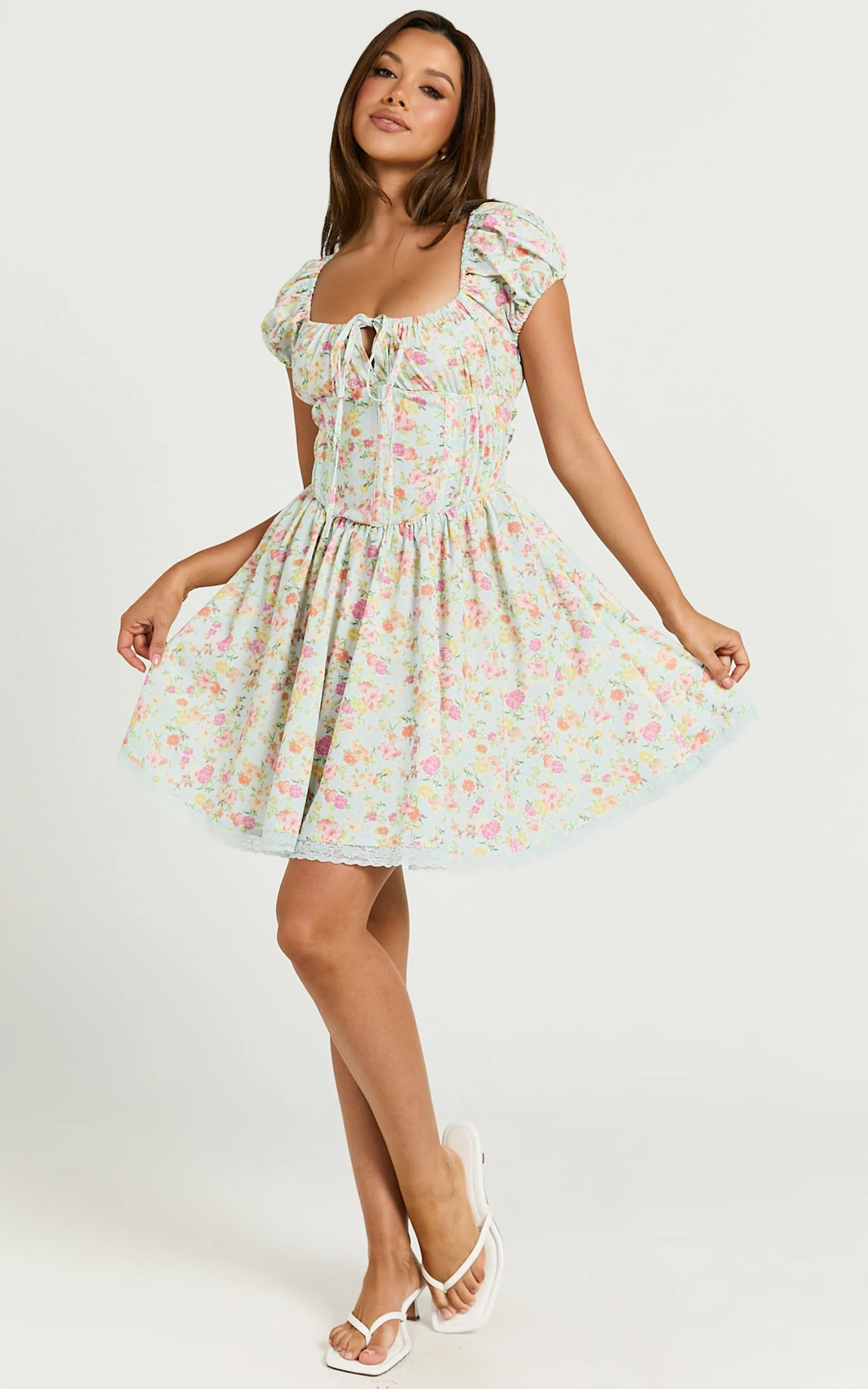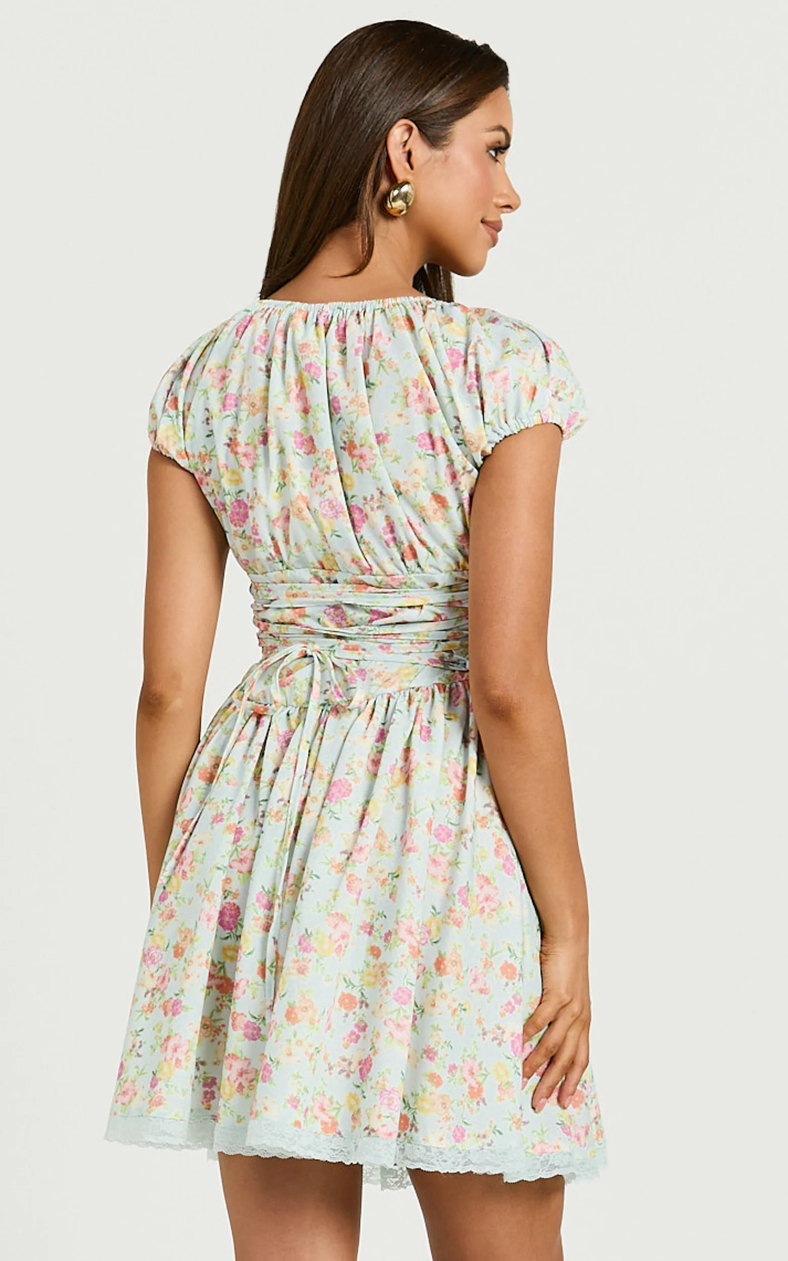 Helen Mini Dress - Strappy Balconette Tie Front Dress in Renaissance Floral Print
