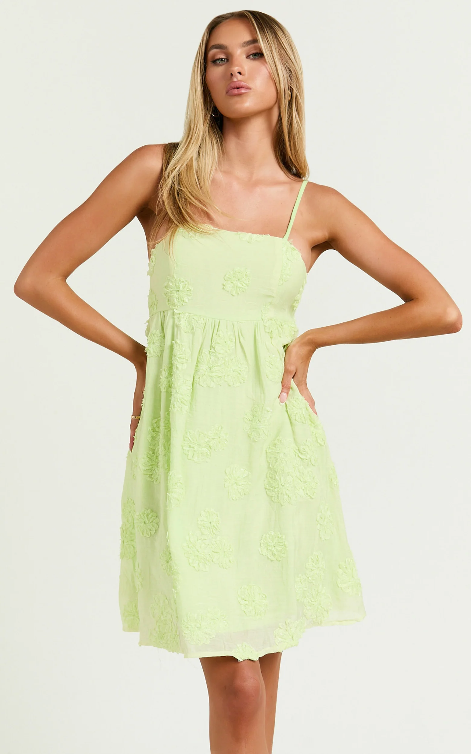 Claya Mini Dress - Sleeveless Straight Neckline Floral Detail Dress in Lime