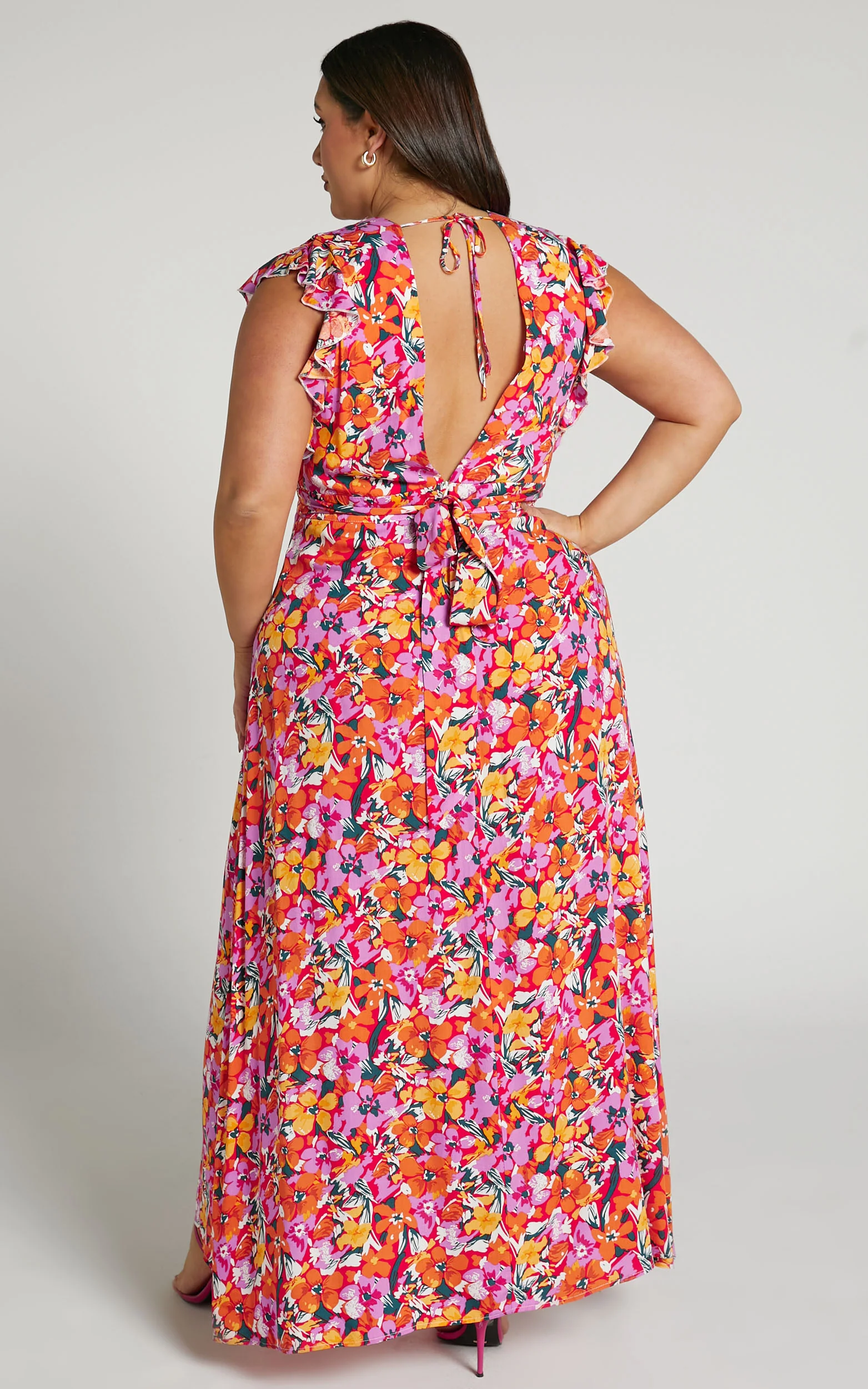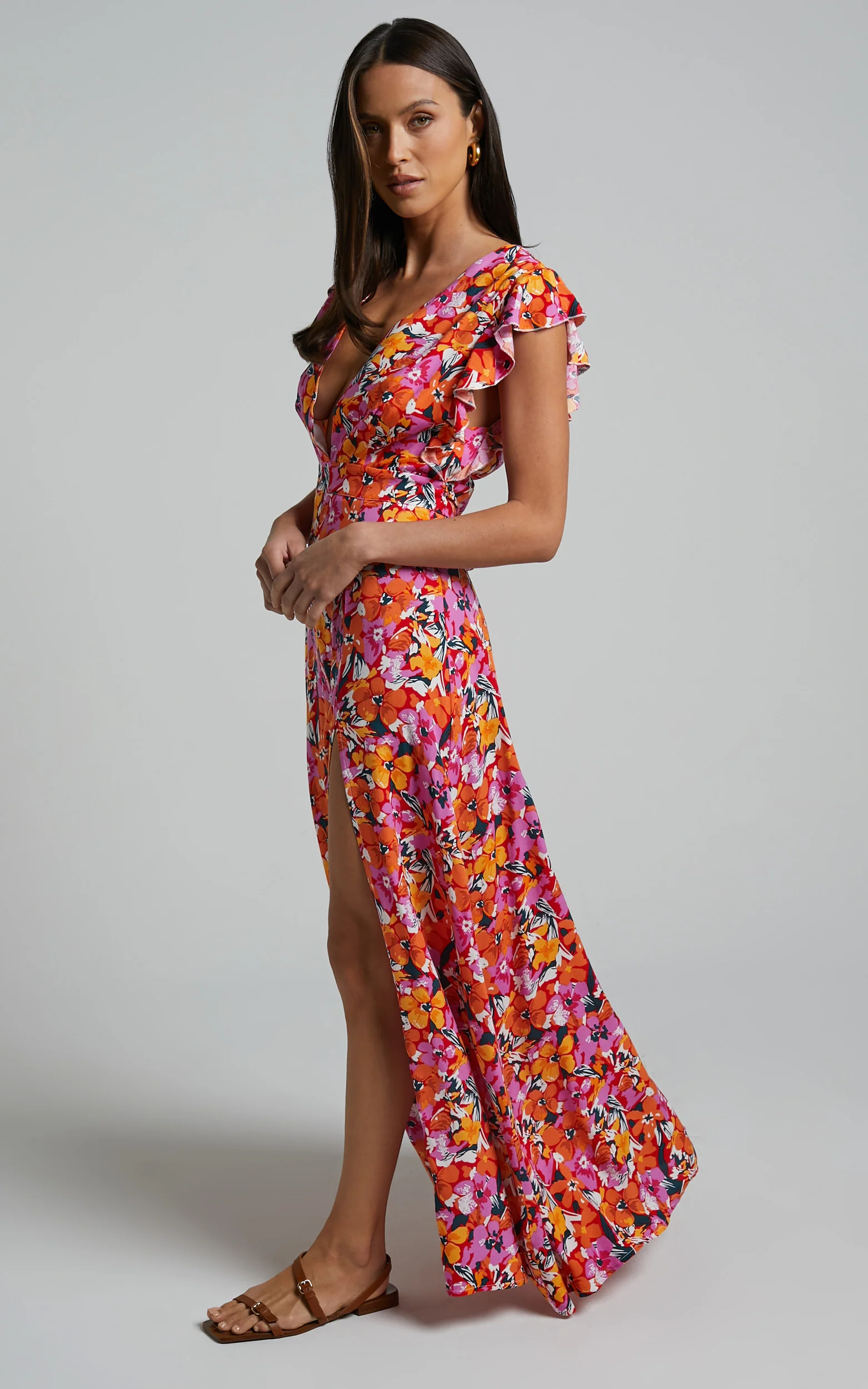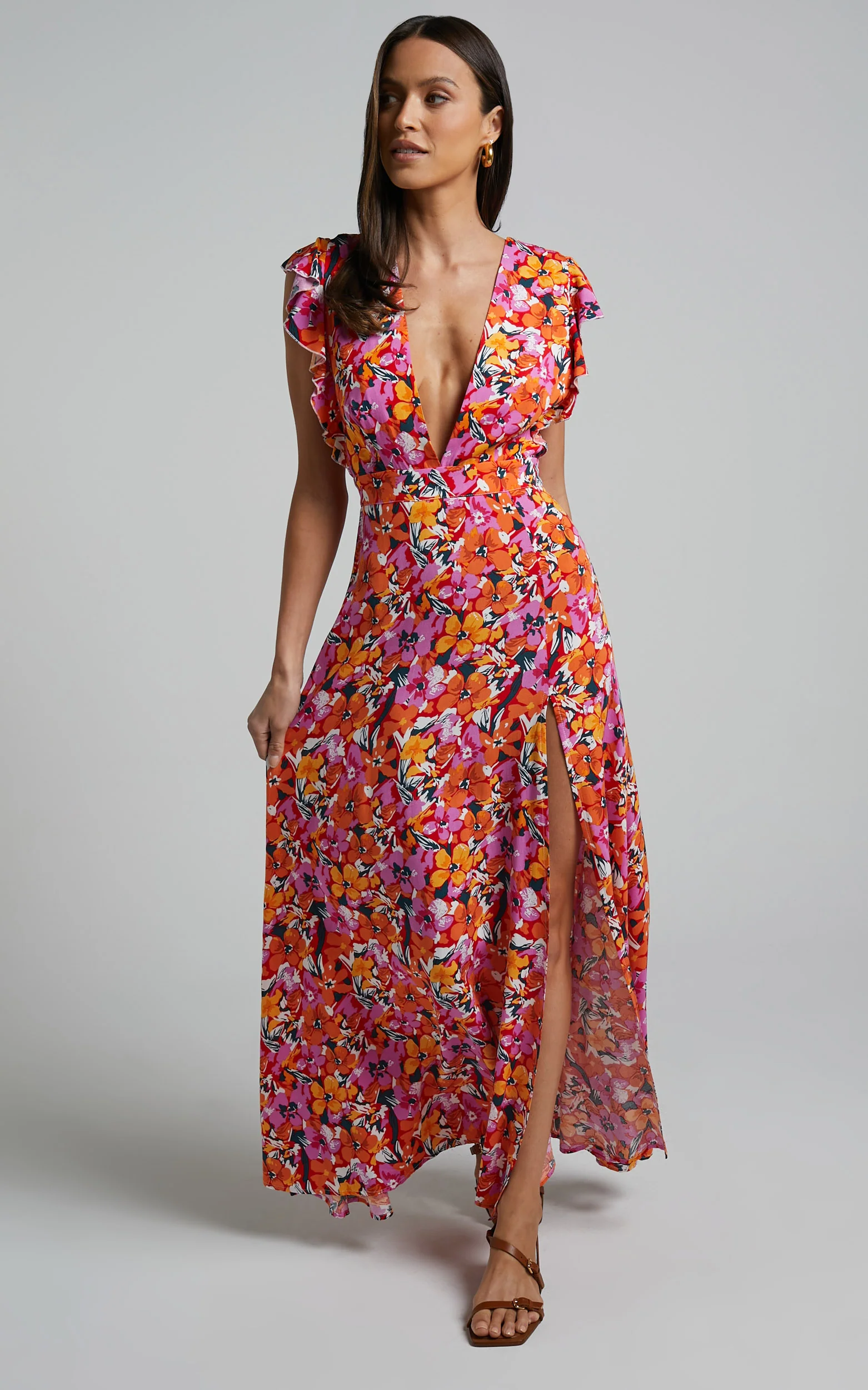 Dyliah Maxi Dress - Thigh Split Frill Shoulder Plunge Neck Dress in Spring Floral