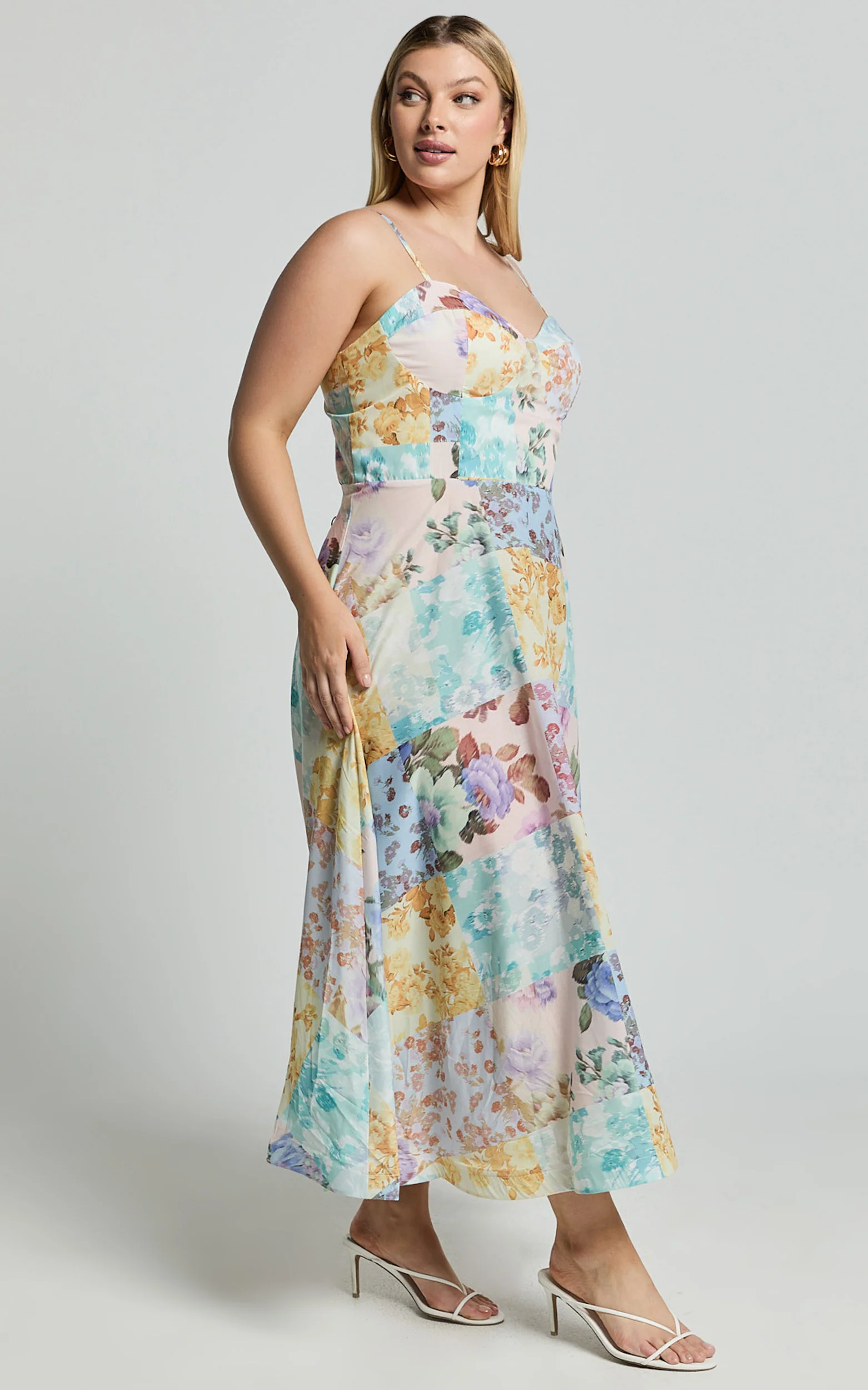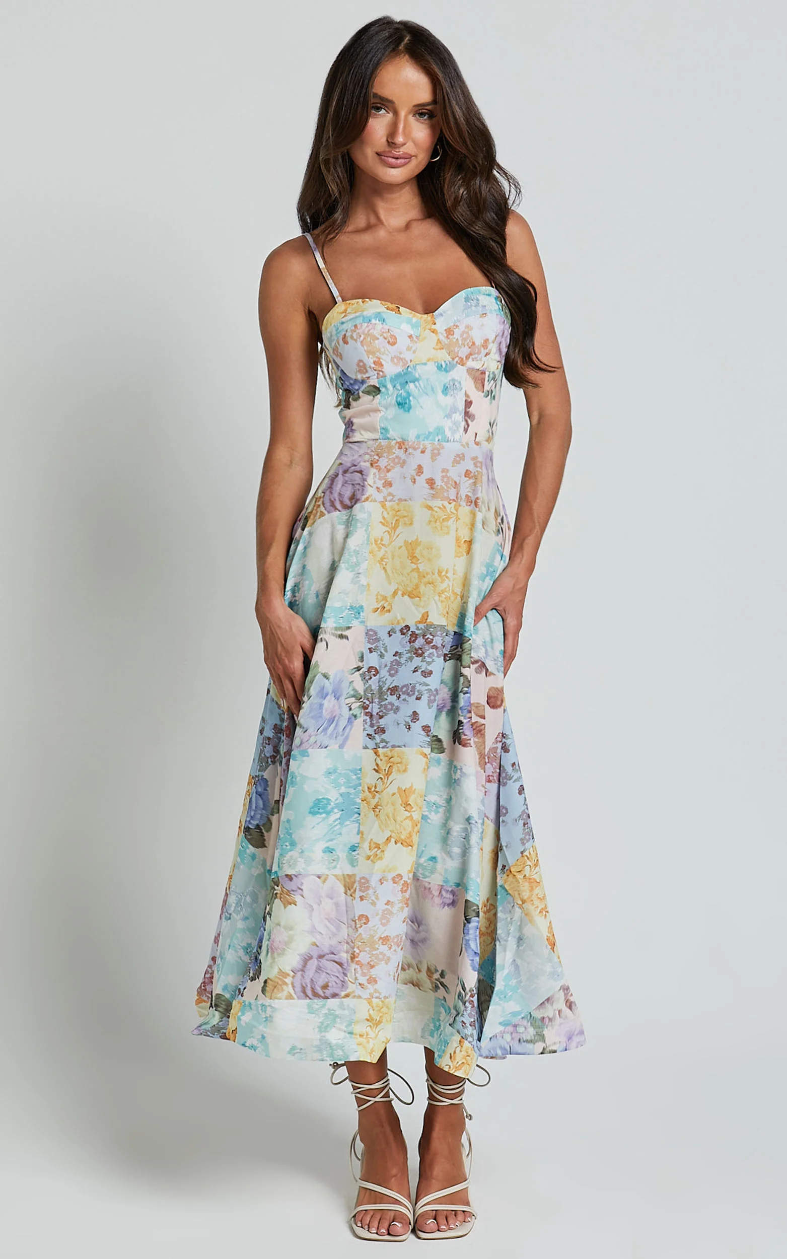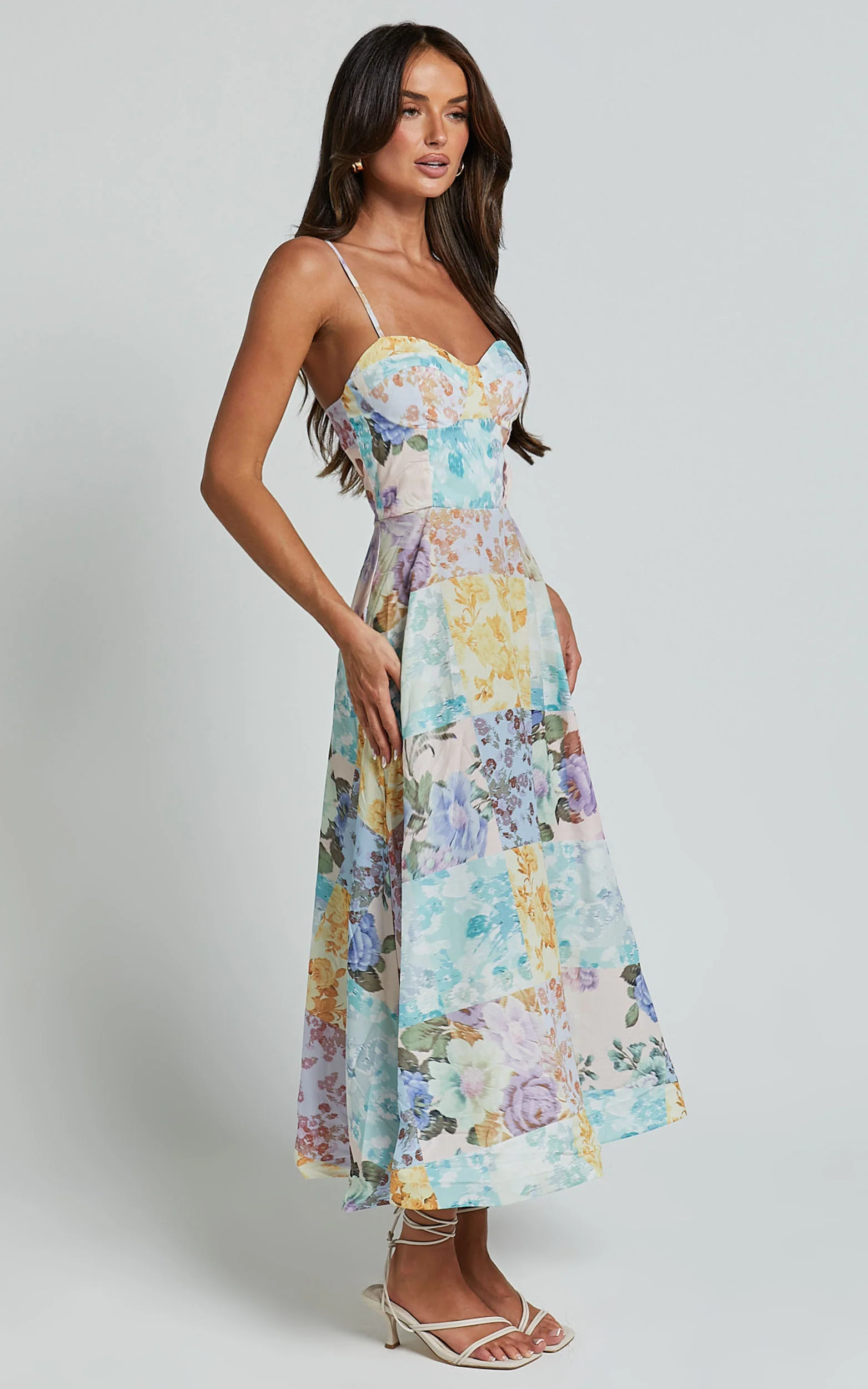 Robertson Midi Dress - Strappy Sweetheart Bustier Flare Dress in Vintage Floral