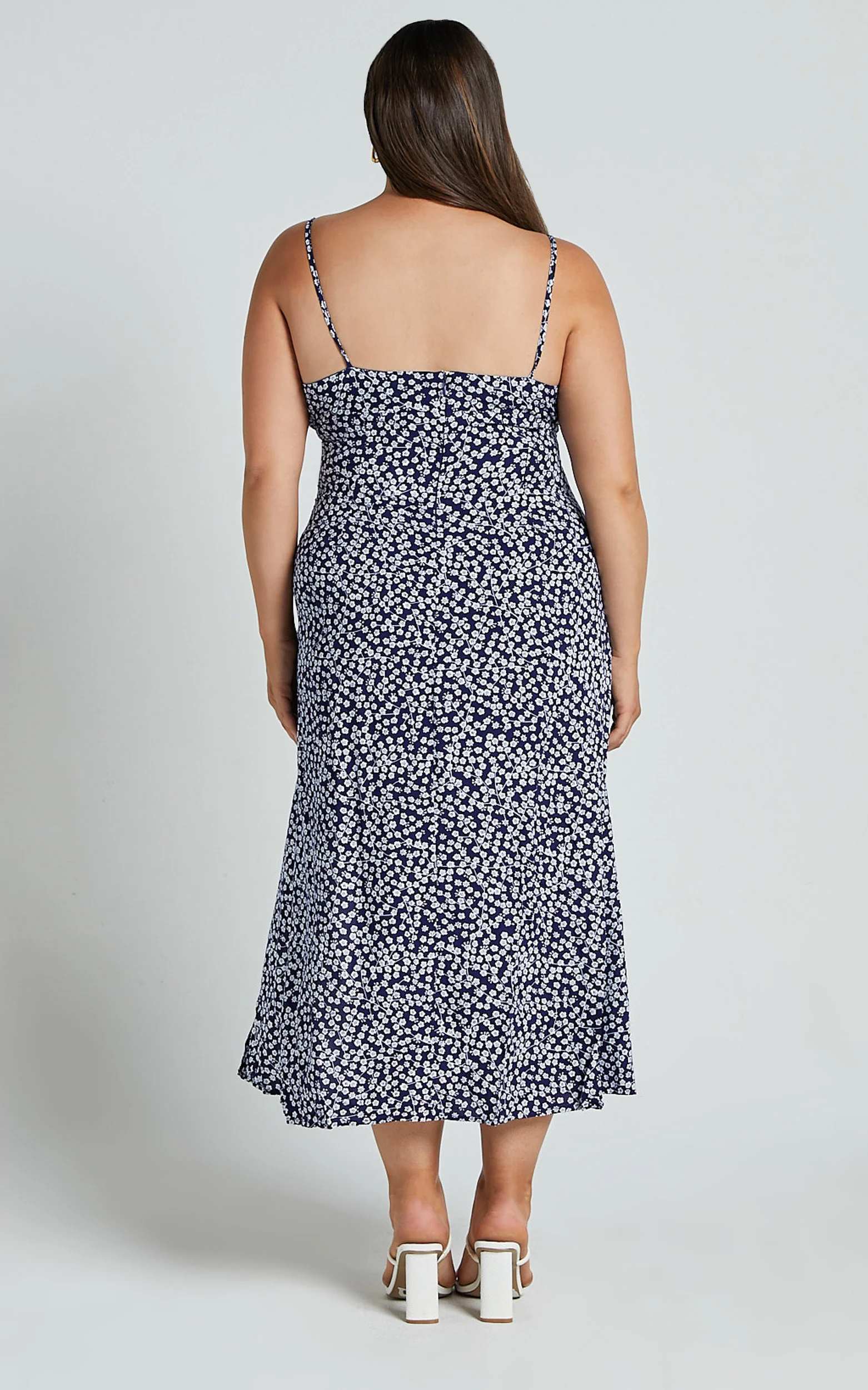 Willa Midi Dress - Ruched Bust Thigh Split Dress in Blue Floral