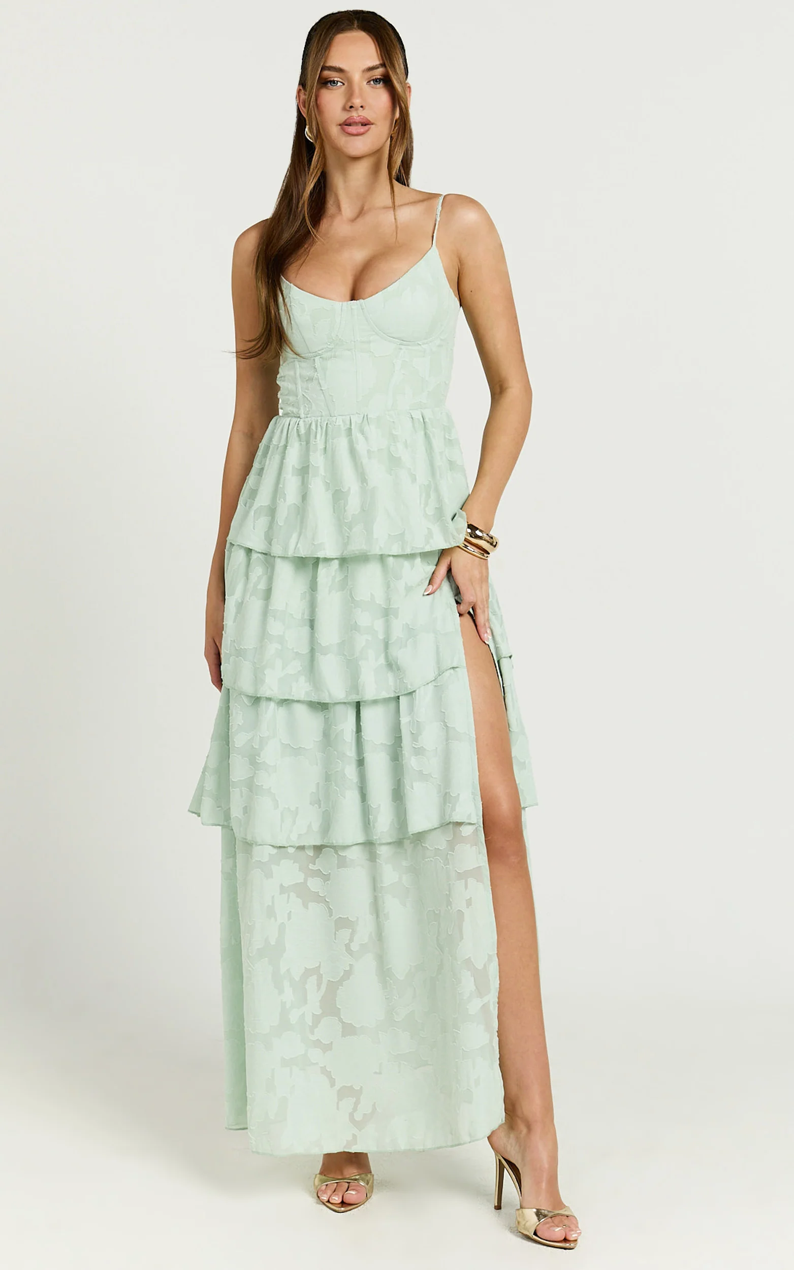 Janezkie Maxi Dress - Femme Tiered Jacquard Formal Dress in Mint