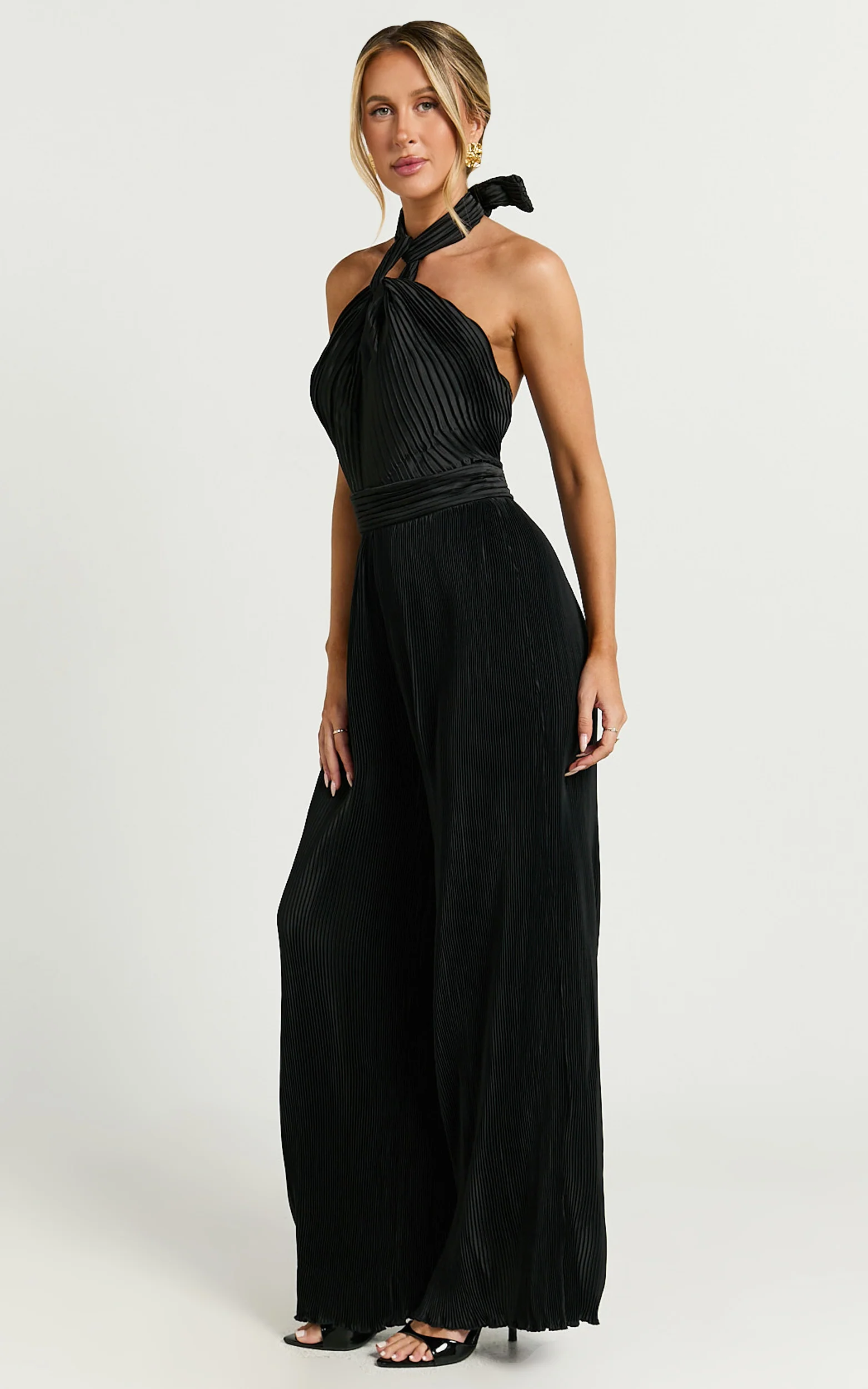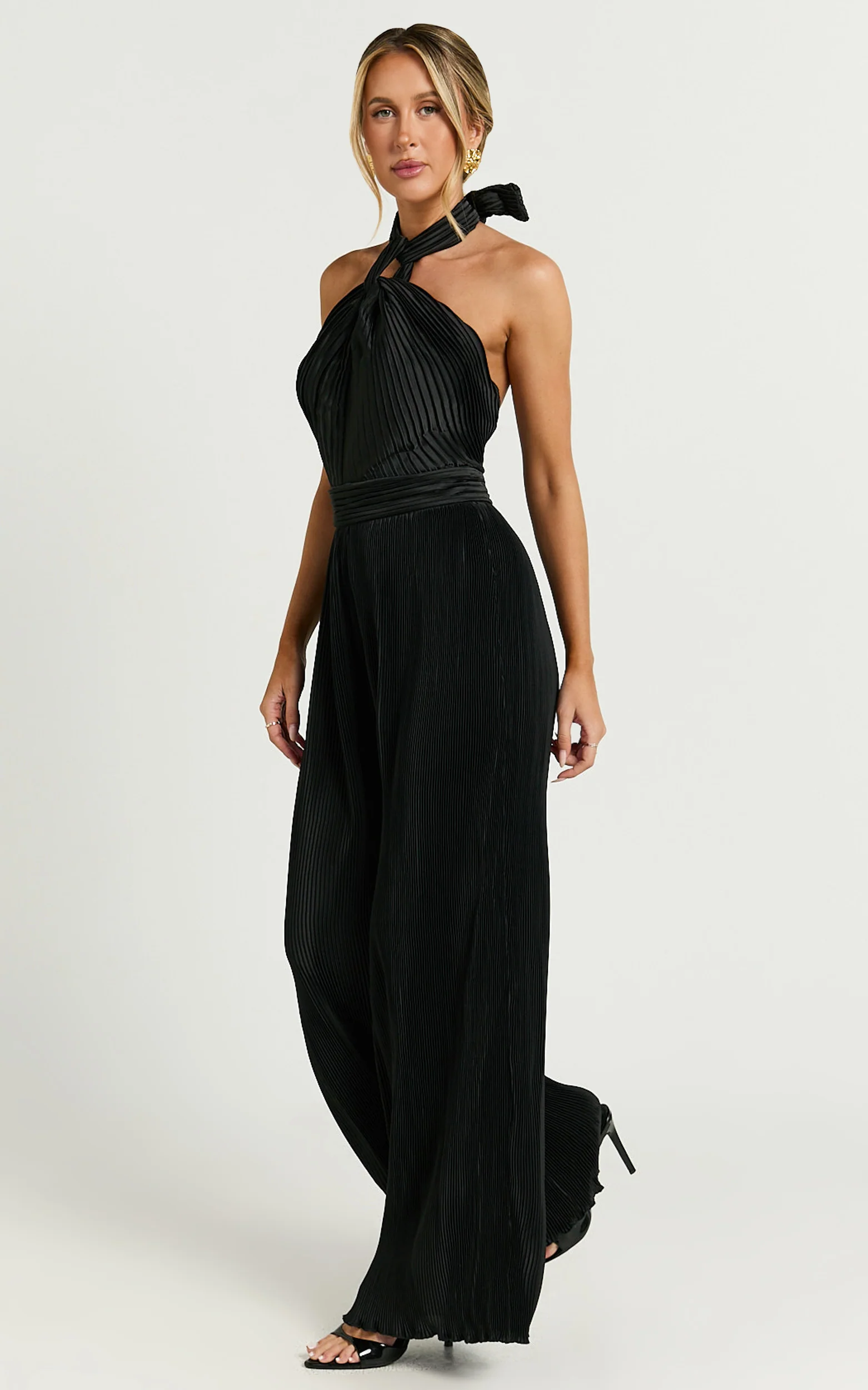 Paris Jumpsuit - Plisse Halter Neck Wide Leg Jumpsuit in Black