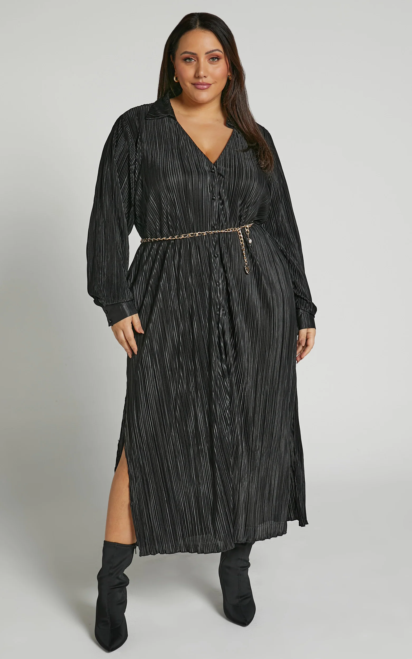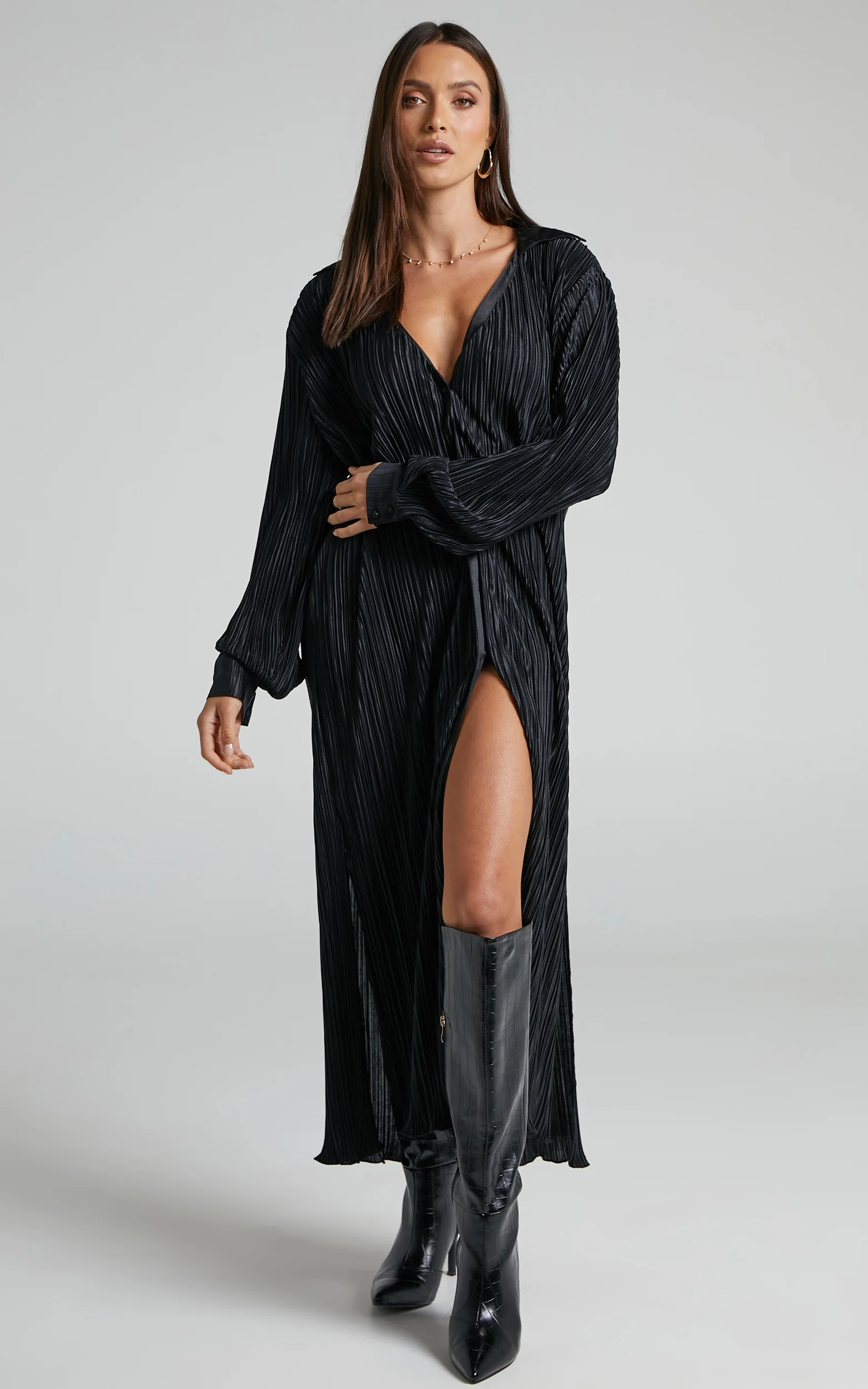 Donelli Midi Dress - Plisse Oversized Collared Shirt Dress in Black