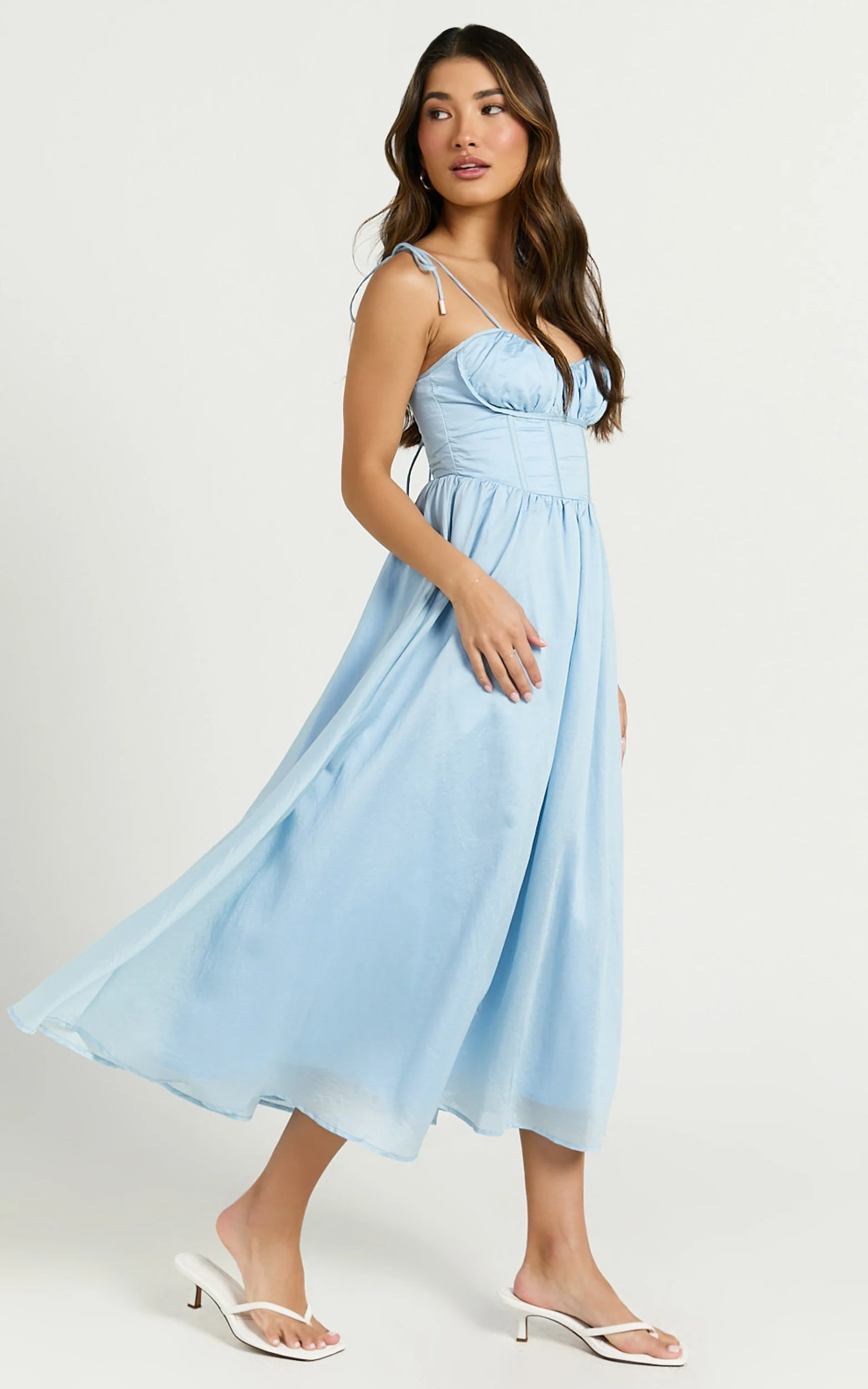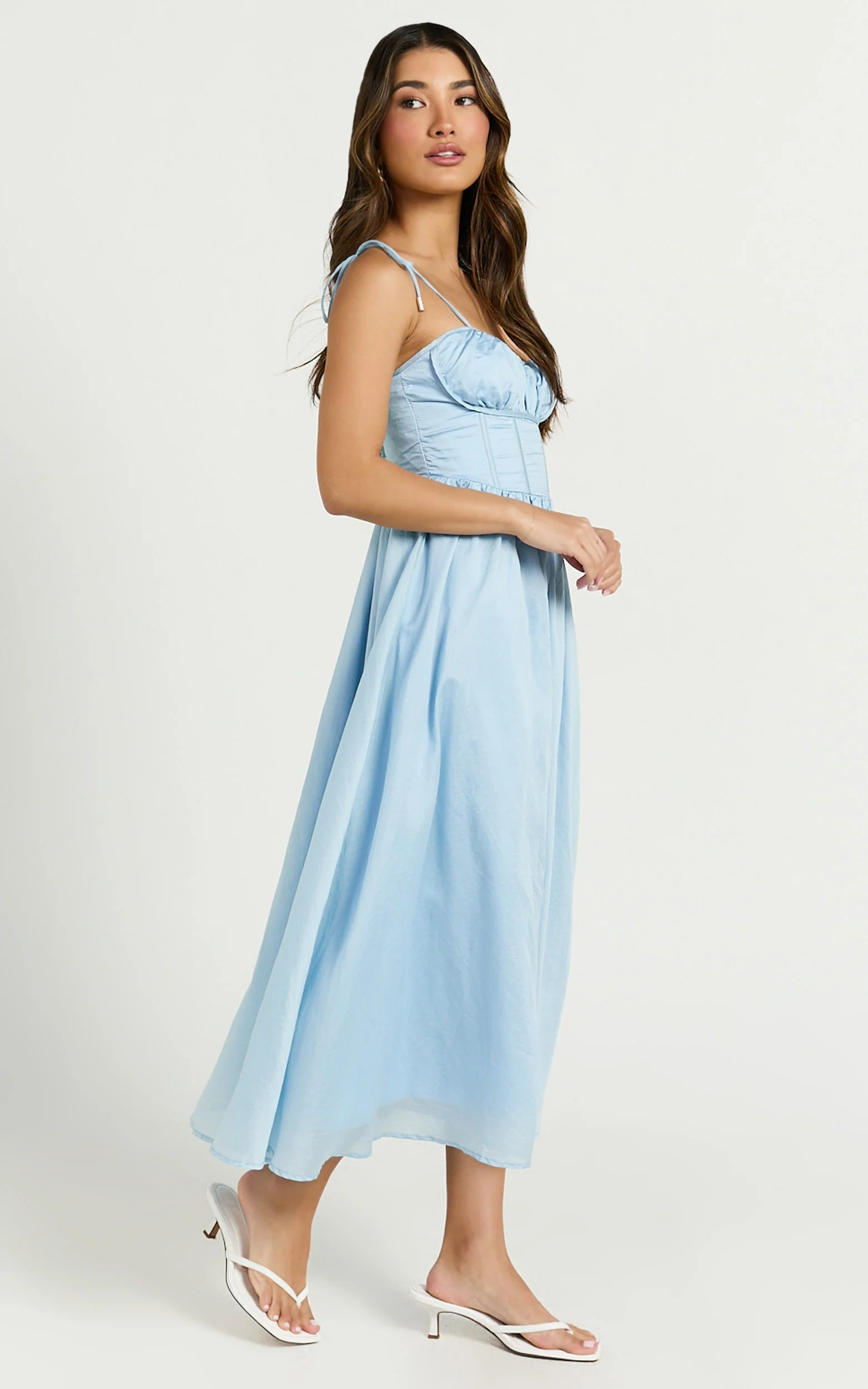Dolores Midi Dress - Strappy Ruched Bust Corset Waist Dress in Blue