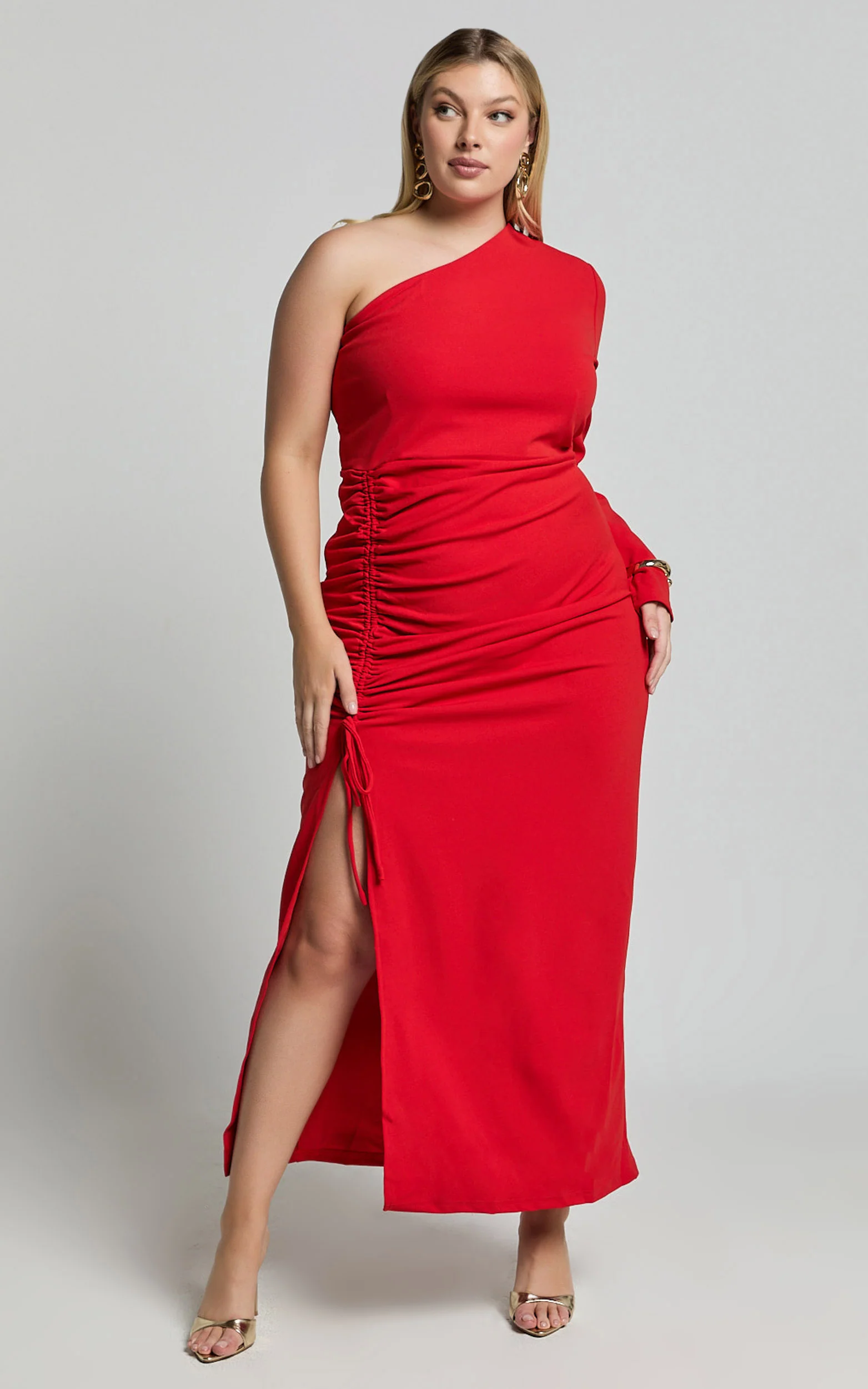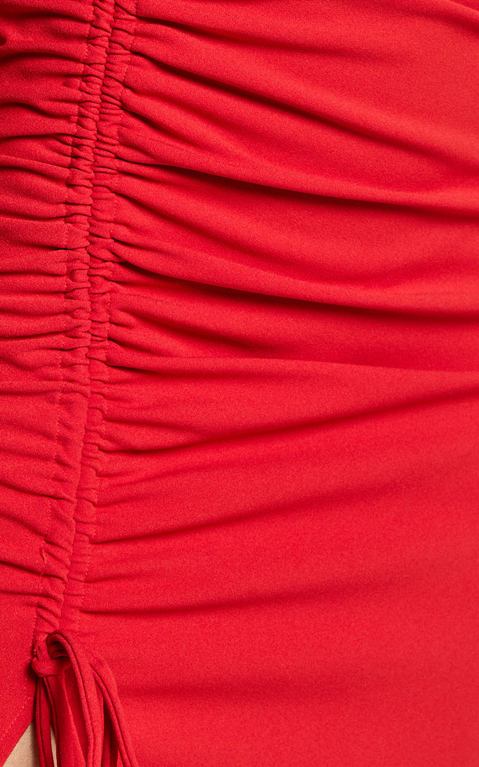 Daria Midi Dress - One Shoulder Long Sleeve Side Split Dress in Red