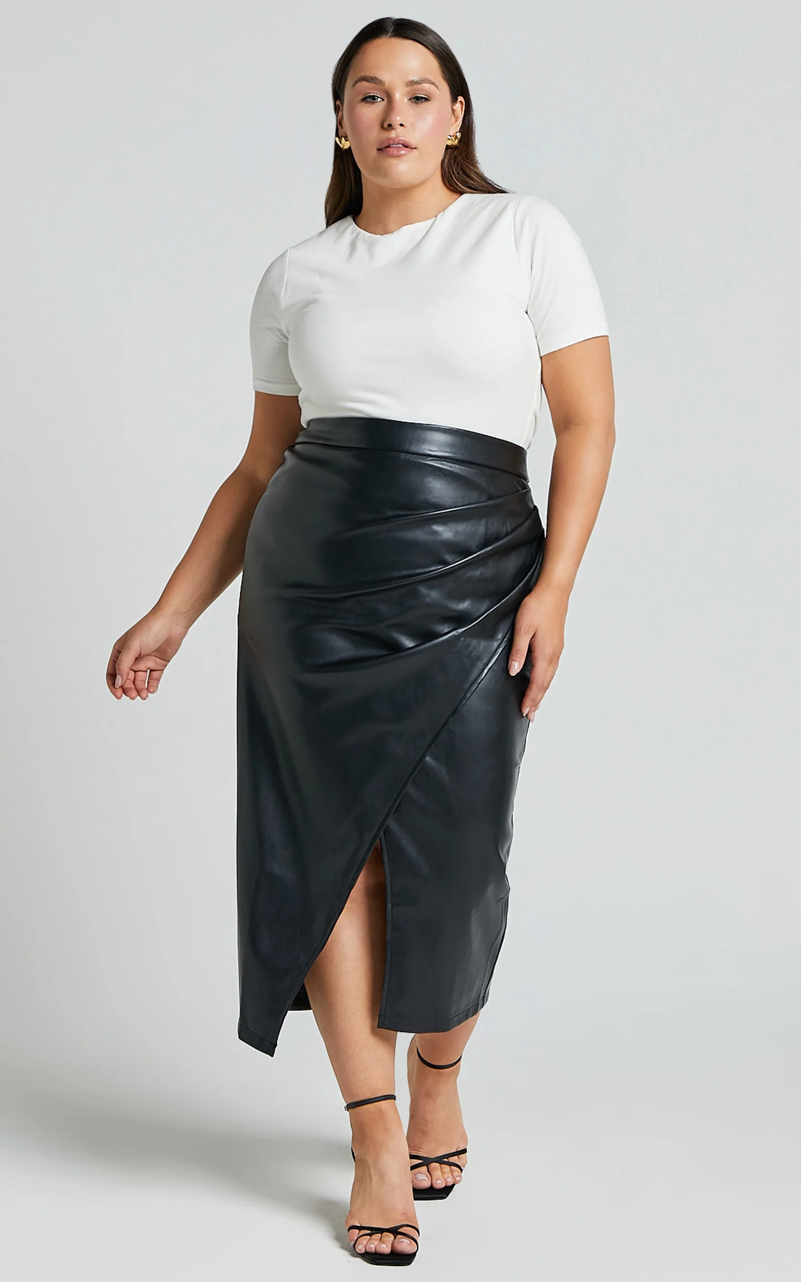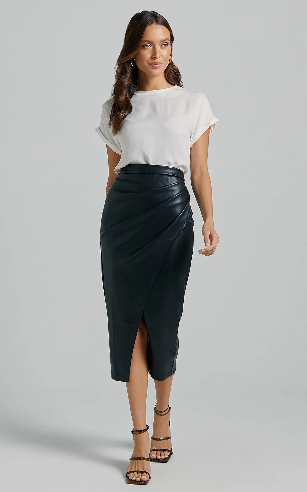 Gena Midi Skirt - Split Faux Leather Skirt in Black