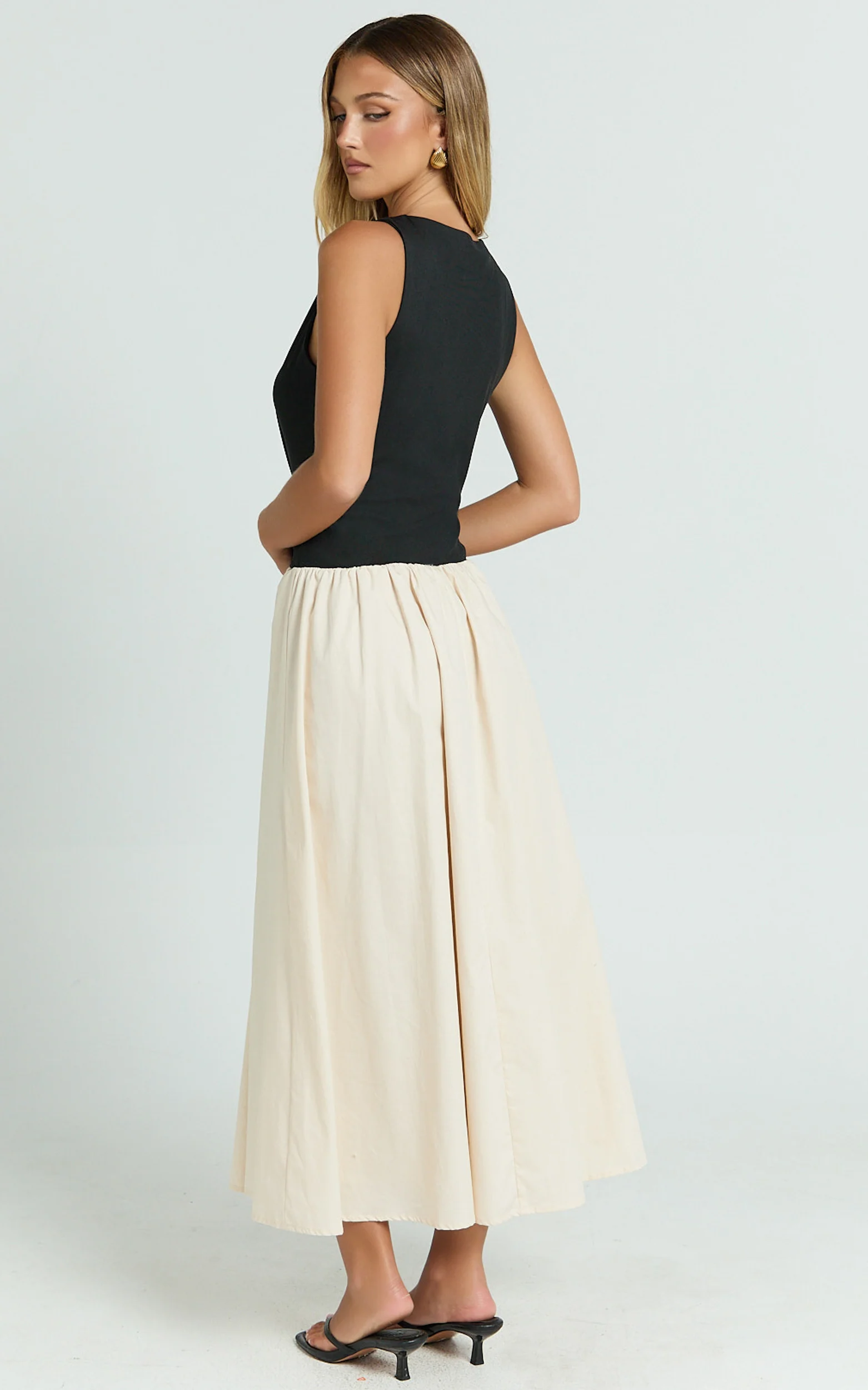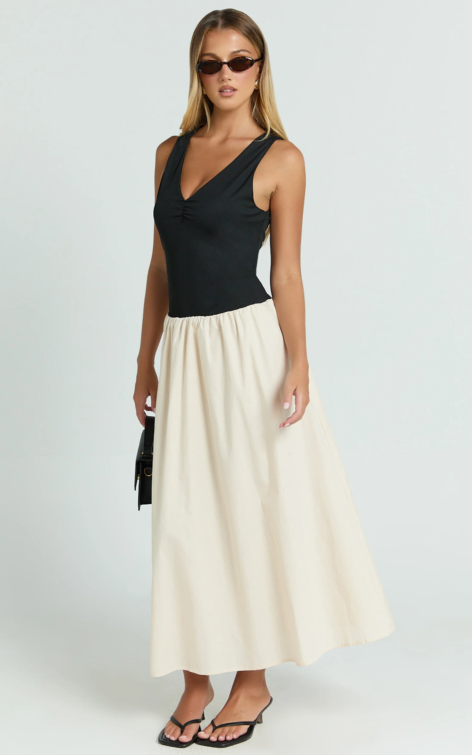 Hermi Midi Dress - Ribbed Bodice V Neck Dress in Cream