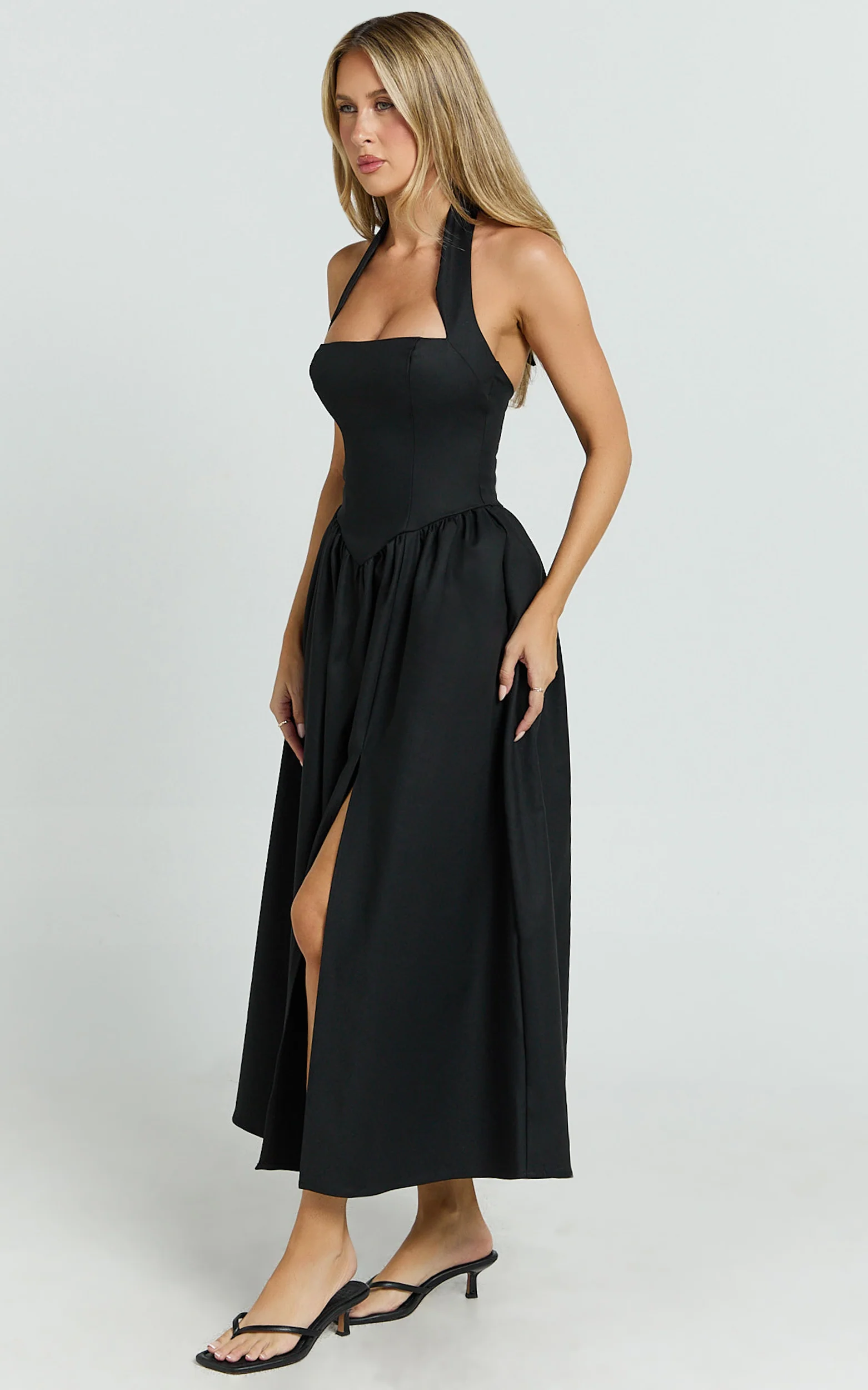 Helda Midi Dress - Halter Tie Neck Corset Panel Dress in Black