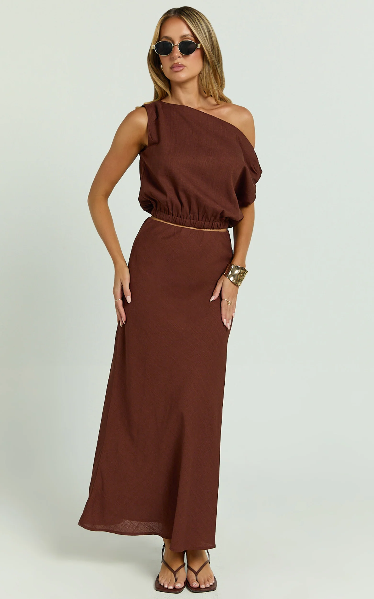 Collins Midi Skirt - Linen Look High Waisted Linen Look Bias Slip Skirt in Chocolate