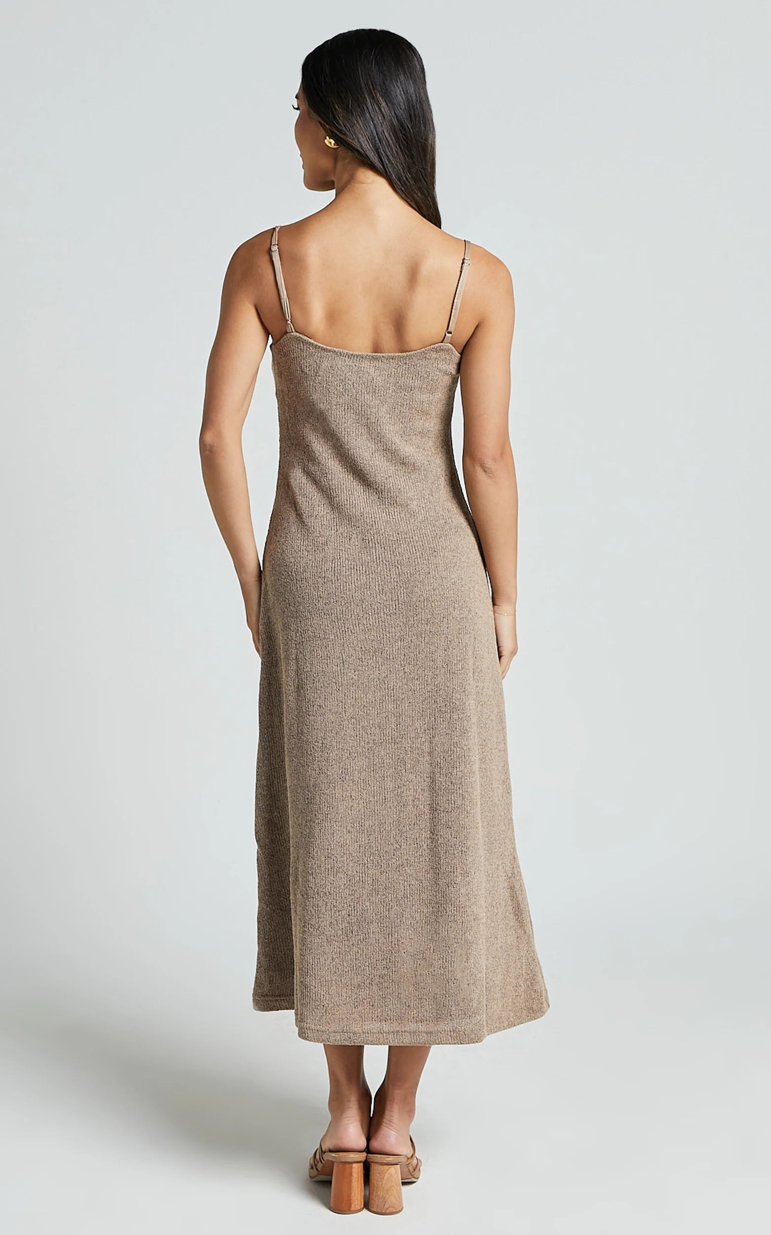 Jessie Midi Dress - Knitted Strappy Scoop Neck Slip Dress in Mushroom