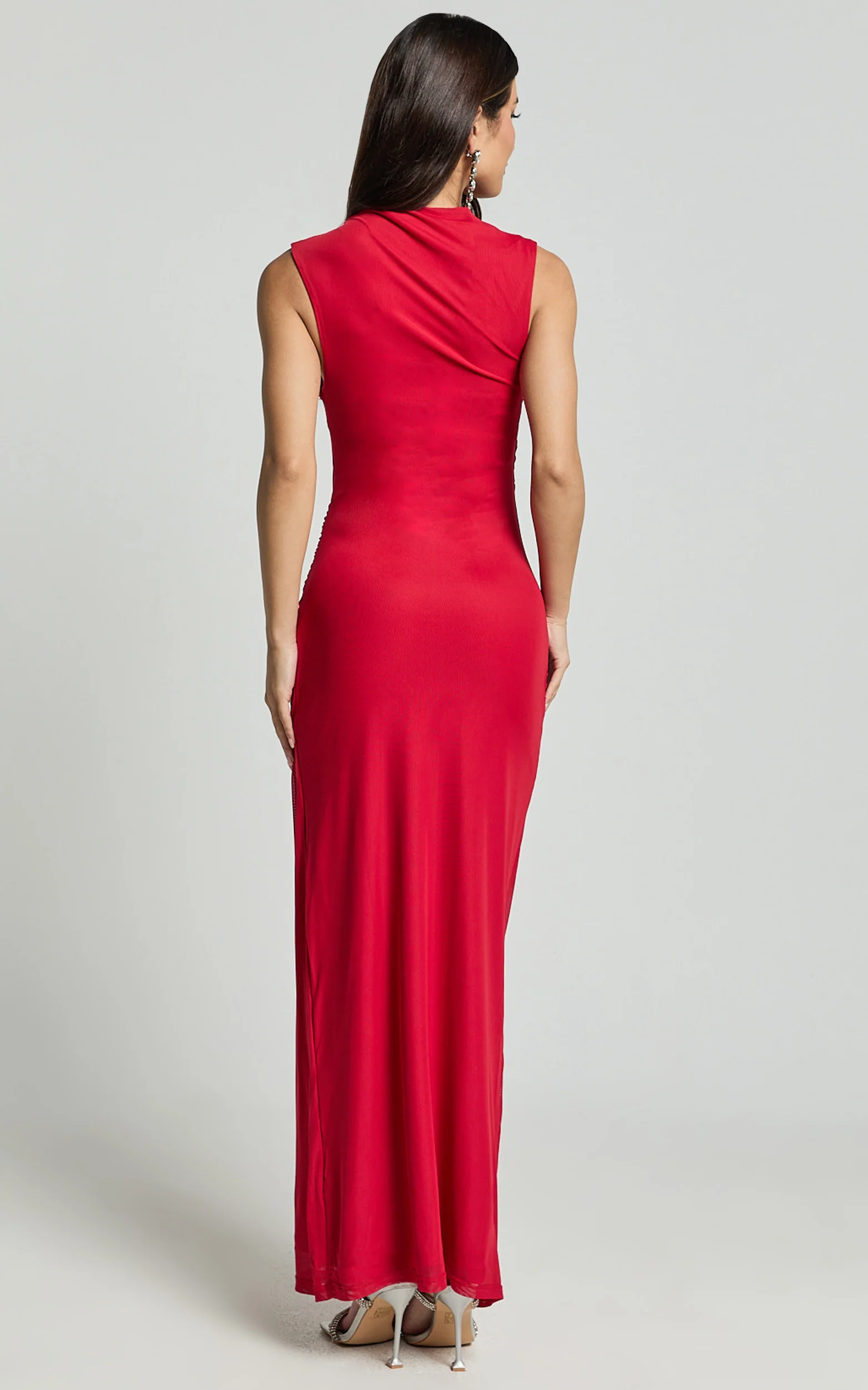 Lara Midi Dress - Asymmetrical Ruched Mesh Dress in Red