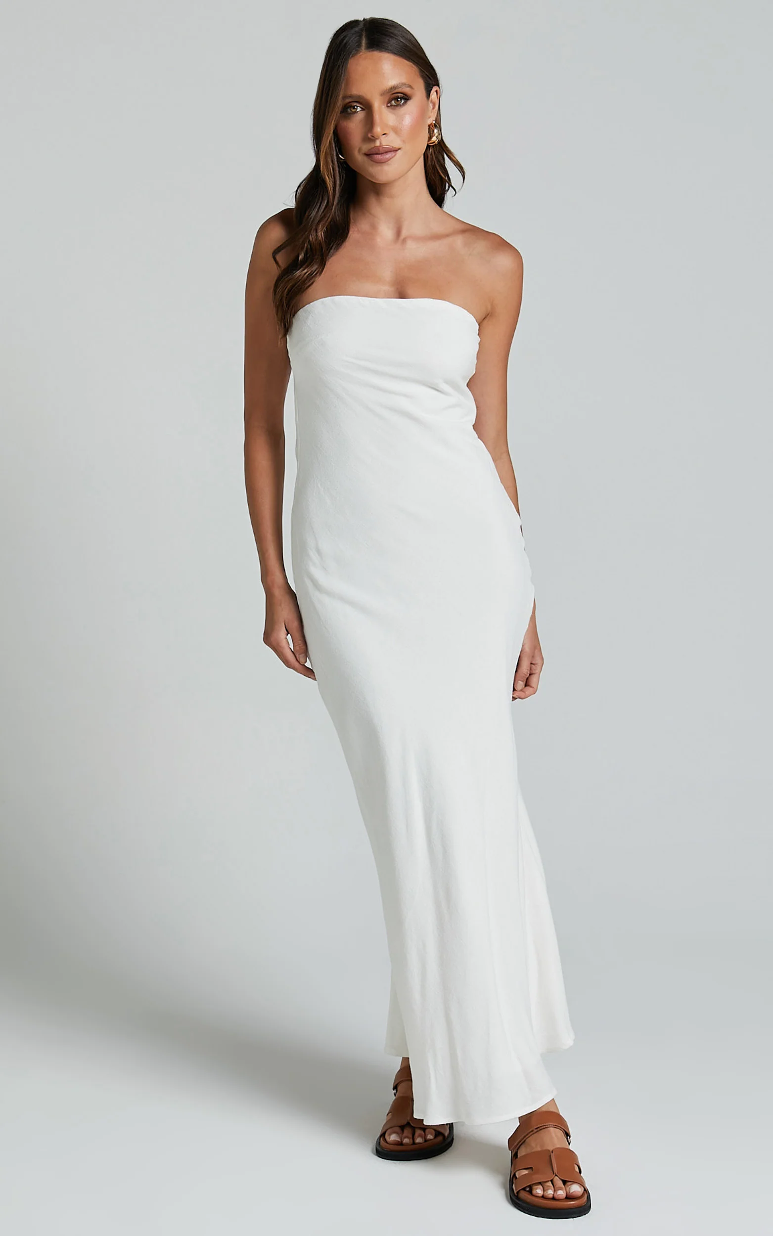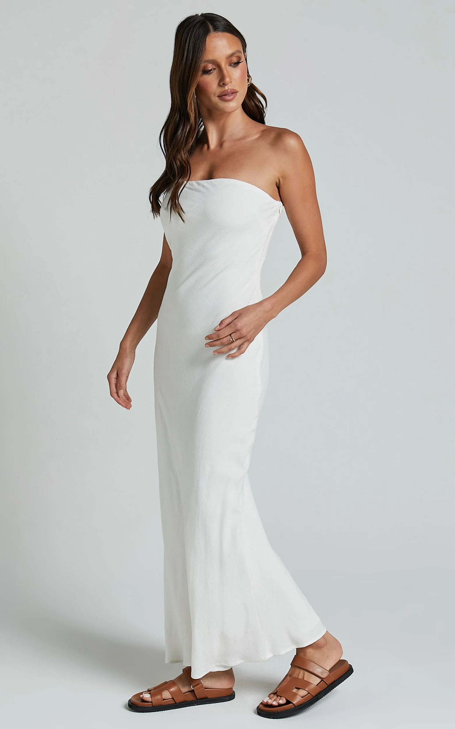 Aaliya Midi Dress - Linen Strapless Slip Dress in Off White