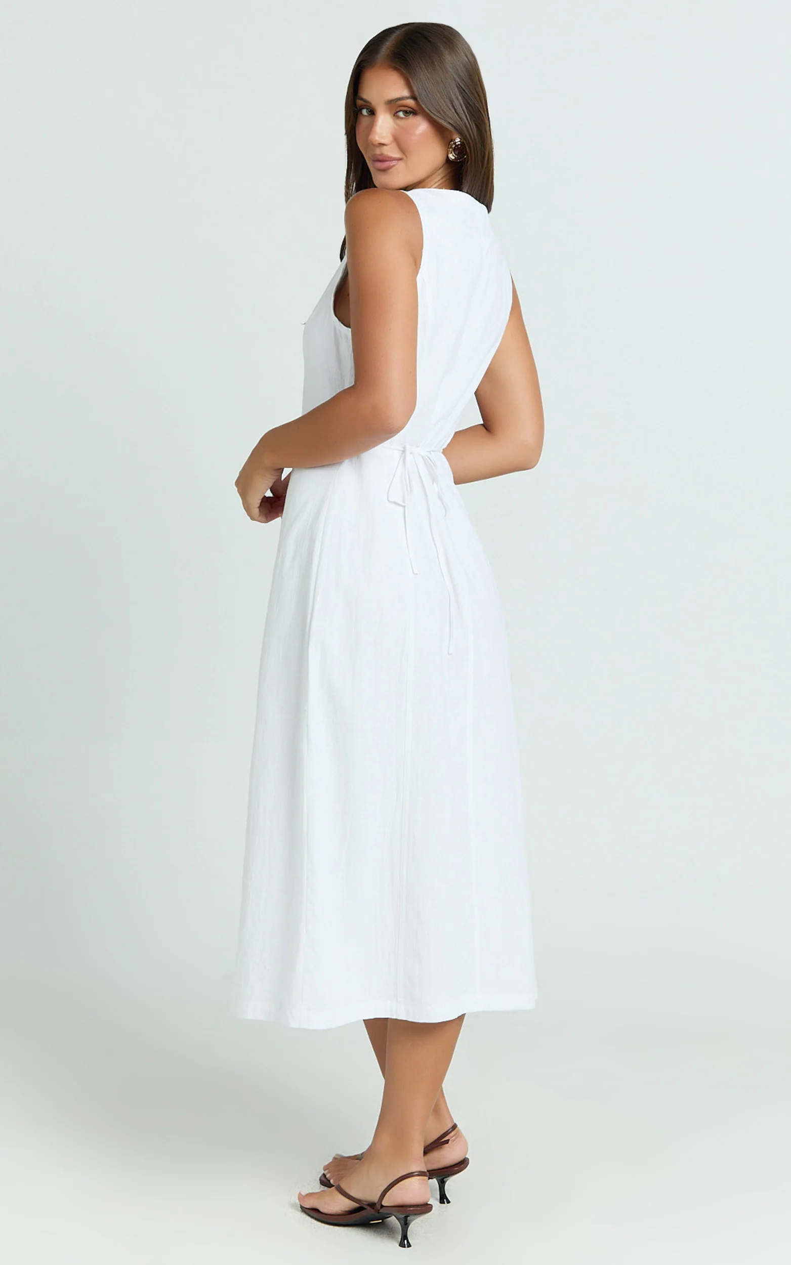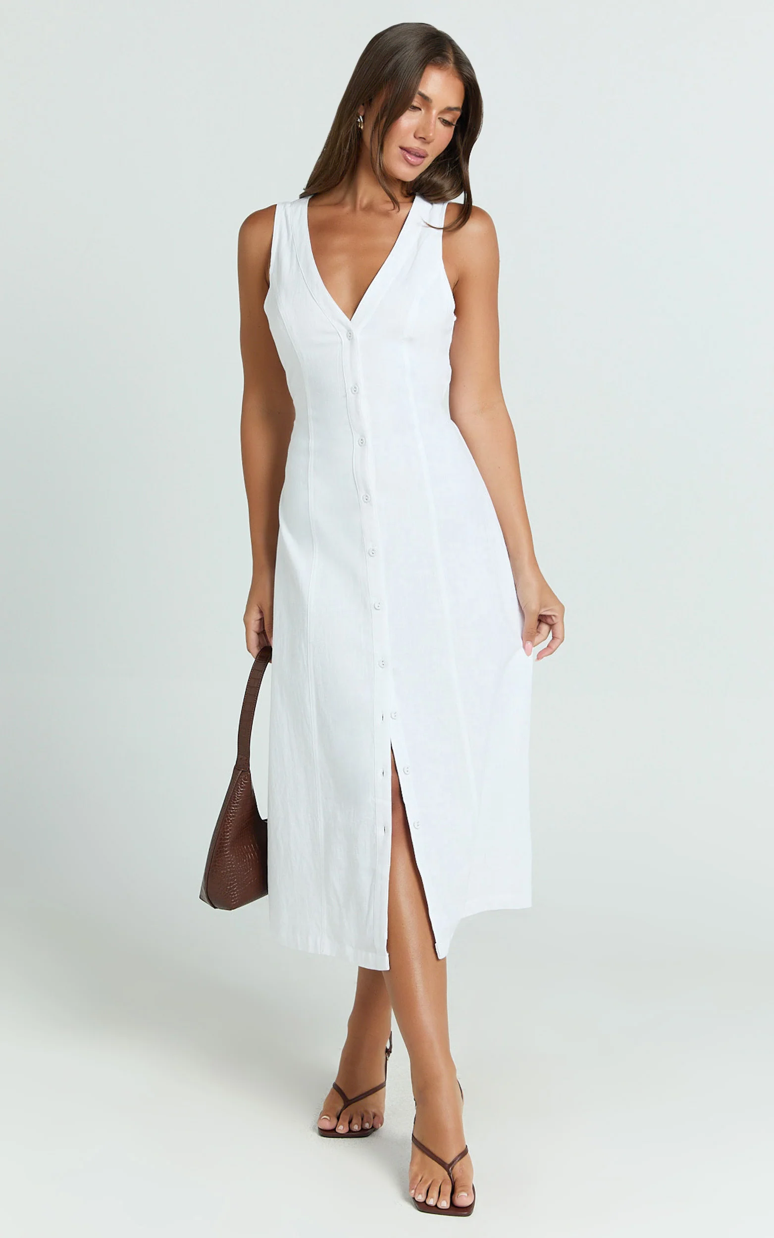 Juliet Midi Dress - Button Through V Neck Dress in White