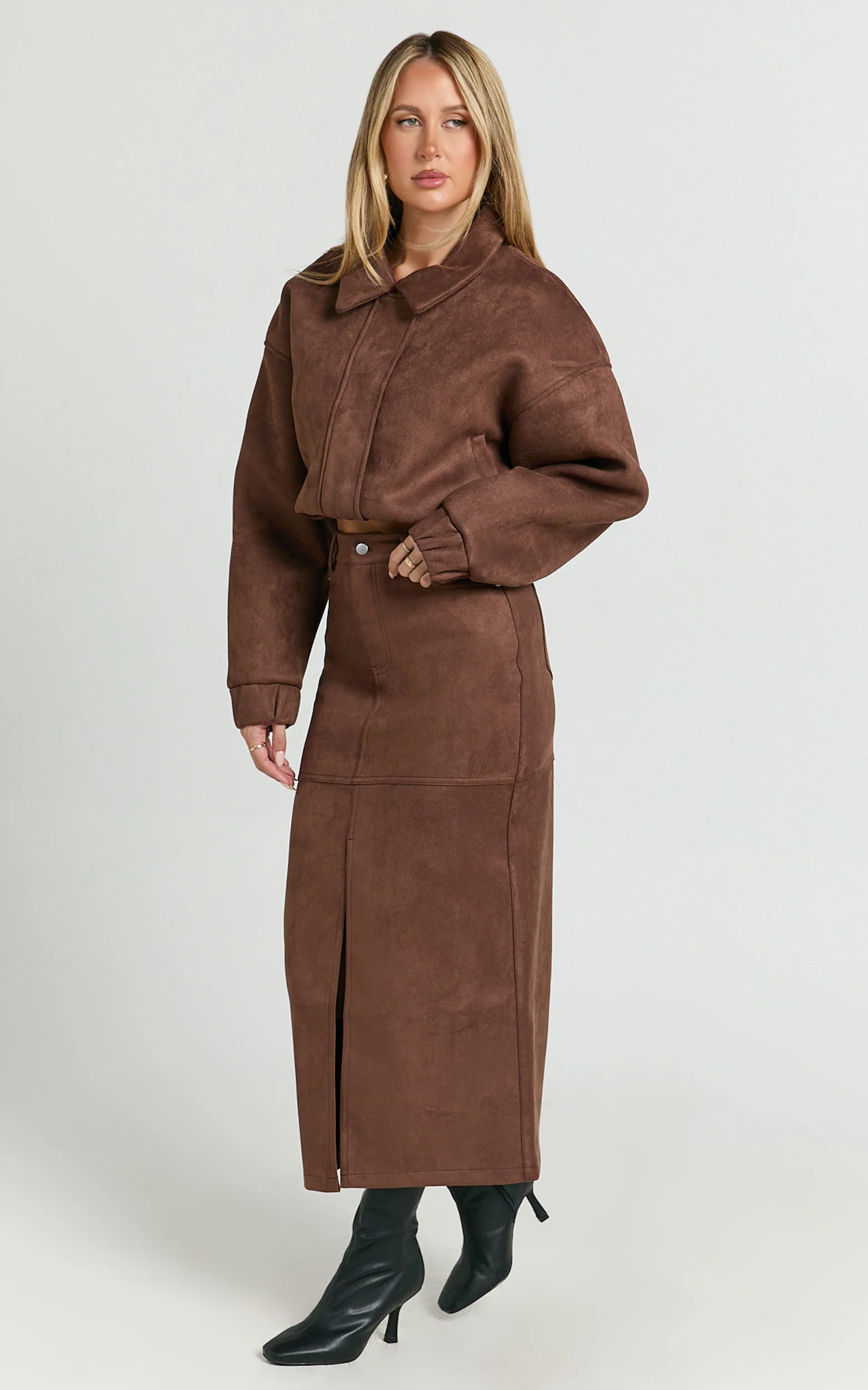 Nessa Midi Skirt - High Waisted Fitted Suede Skirt in Dark Chestnut