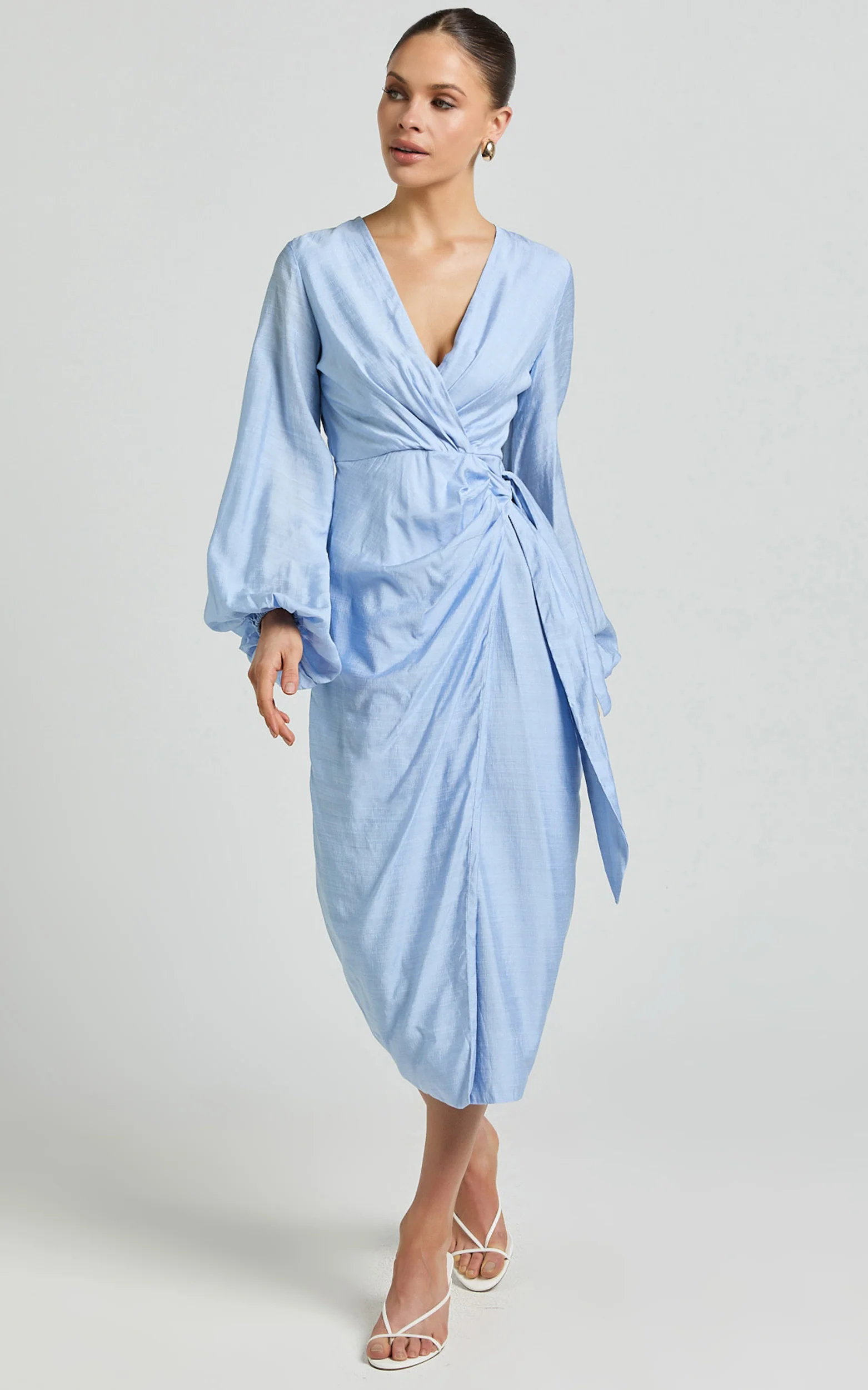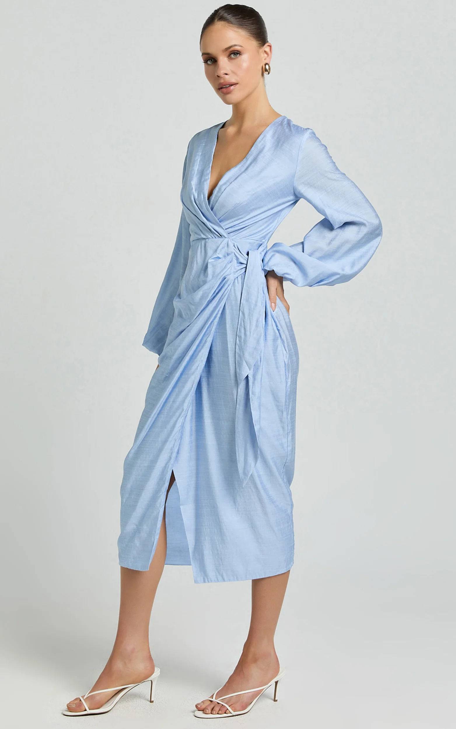 Taylor Midi Dress - Long Sleeve Wrap Dress in Blue